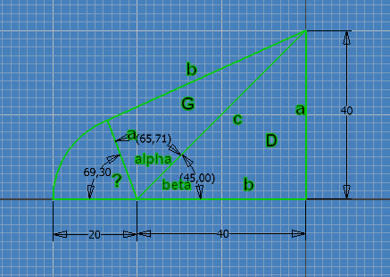 Hallo, hier habe ich mal was für die Mathematik Fraktion: So soll die Spitze am aussehen, aber wie kann man das berechnen? Der alte Pyto macht es uns vor!  (die Zeichnung stimmt nicht ganz, aber der Rechenweg wird es verdeutlichen) Hier das erste Dreieck: a=40mm, b=40mm, c=?, alpha=? c=sqr(a^2+b^2) =56,569mm alpha=atan(h/p) h=sqr(p*q) p=c-q q=a^2/c =40^2/c =40^2/56,569 =28,284mm p=56,569-28,284 =28,284mm h=sqr(28,284*28,284) =28,284mm alpha= atan(28,284/28,284) = 45 Grad Jetzt das zweite Dreieck: Der Radius des Kreises ist 20mm q=20^2 / 56,569 =7,071 p=56,569-7,071 =49,498 h= sqr(49,498*7,071) =18,708 alpha= atan(18,708/49,498) = 20,705 Grad beta= 90grad - alpha = 90 - 20,705 = 69,295 grad Jetzt einfach alles von einander abziehen: ? = 180 - beta - alpha = 180 - 69,295 - 45 = 65,705 Grad