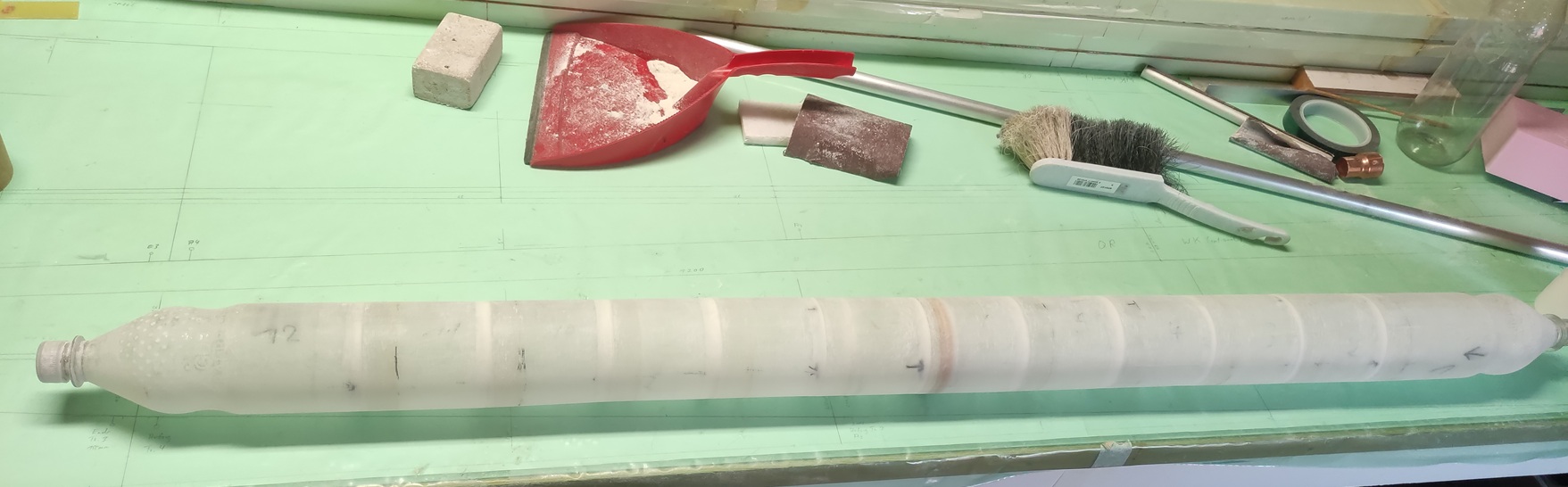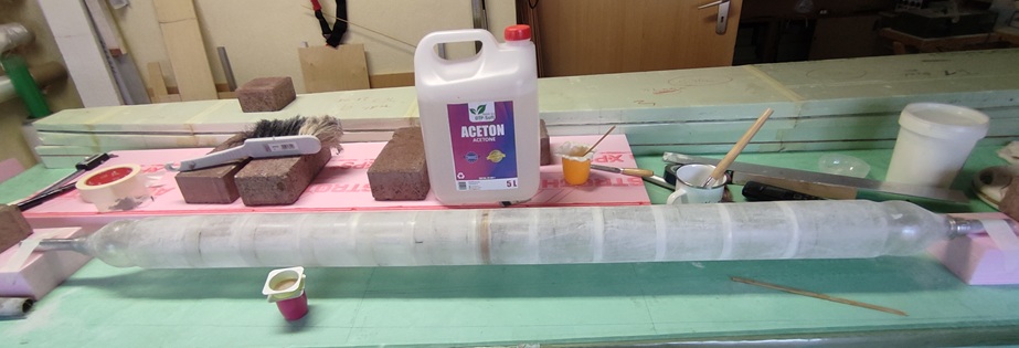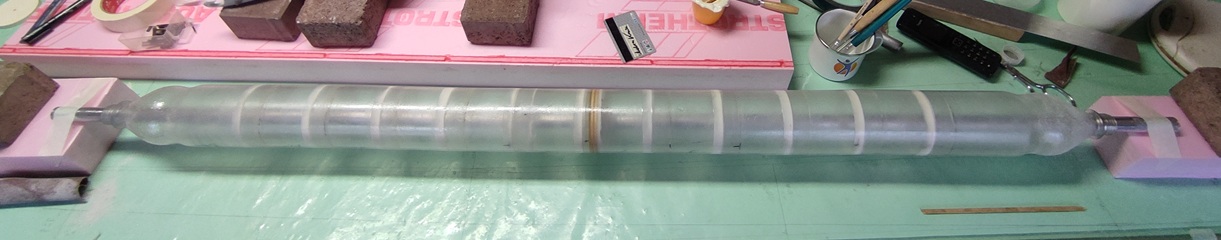 heute habe ich die Übergänge der einzelnen Segmente geglättet/gefüllt . Dazu wurden alle Bereiche abgeklebt , wieder mit Epoxidkleber ohne "Füllstoffe " eingestrichen und sogleich mit angedickten ( Microballons / Thixotropiermittel) selbigen Kleber und per Kreditkarte glatt abgezogen. Das Ausfüllen dichtet zu dem den äußeren Rand zusätzlich ab und verklebt sicher mit dem späteren Laminat des Drucktank !Mit Hilfe des Alurohr ( zünftiges Startrohr) konnte der Tank schön gleichmäßig gedreht werden . Wenn die Sache ausgehärtet ( zäh-hart ) ist ,wird der ganze Tank nochmals beschliffen ,per Aceton behandelt und dann mit GFK oder CFK verstärkt . Diesbezüglich will ich noch einmal die Gewichtsbilanz im Auge behalten b.z.w. mit Hilfe der Zugscherfestigkeit (S) den max. Druck für die laminierte "Glas-oder Kohleröhre" überschlägig mit der Barlow -Formel berechnen : P = (2xSxt)/D ! ...das Abklebeband wurde komplett entfernt ,bevor der Kleber aushärtet...!! ...Danke Andreas (Bäckchen) für dein Feedback ...! Noch nen Update von heute : Ich habe den kompletten Tank angeschliffen (Übergänge waren ausgehärtet ) und mit Aceton "entfettet ".Dadurch ,das der Epoxidkleber/Mischung ziemlich gut "klebt"/haftet auf dem PET ,selbst ein vorsichtiges kratzen mit nen Cuttermesser hat nichts vom Tank abgelöst (kein Abplatzen) ,wurde nochmals eine Mischung "angerührt" (ohne Zusätze)und auf die gesamte Oberfläche verteilt...sozusagen als Primer/Kupplungsschicht für das Laminat ! ...angeschliffen.. ...mit dem Klebeharz geprimert... Das ganze wird dann natürlich vor der Beschichtung/Verstärkung nochmals angeschliffen..!