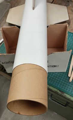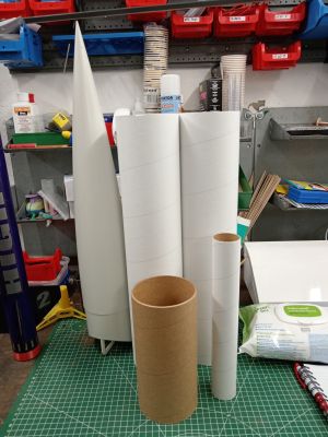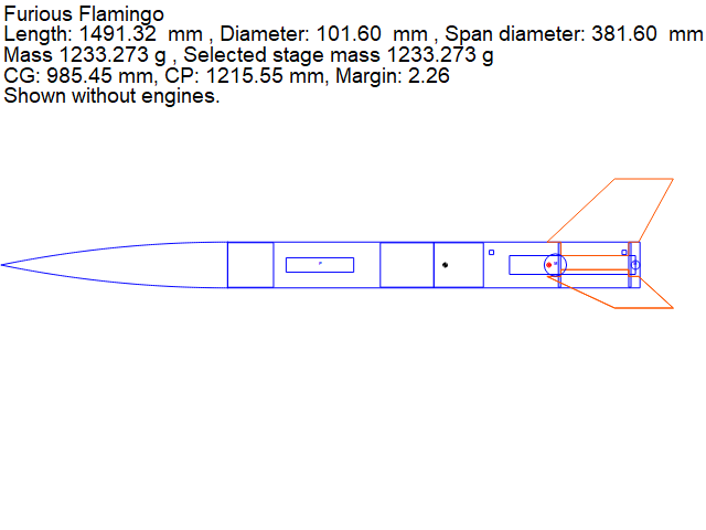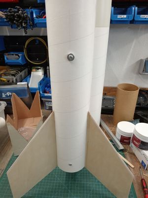 Gestern habe ich mit dem Bau der "Furious Flamingo" offiziell begonnen, nachdem ich noch einige Änderungen vorgenommen habe. Ich wollte die Stabilität auf jeden Fall größer 1 Kaliber haben. Die 0,9 vom letzten Stand waren mir nicht recht, also habe ich das Design der Flossen deutlich verändert. Zwar gefielen mir die vorherigen Flossen besser, aber dafür habe ich jetzt gute 2 Kaliber Stabilität (und das ist mir jetzt wichtiger, als das Aussehen).