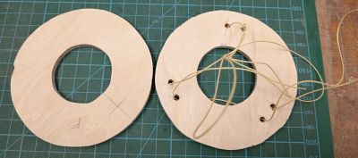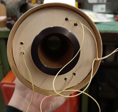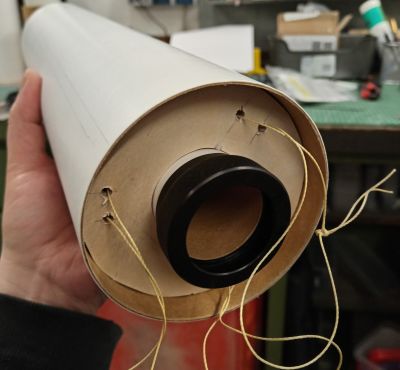 Dem hinteren Zentrierring habe ich dann gleich noch ein paar Löcher und eine Kevlarschnur verpasst, damit ich diesen wieder aus dem Körperrohr herausziehen kann. Wenn der Frontring also später im Körper geklebt ist, kann ich so den Ring wieder entfernen und die Flossen entspannt einkleben. Wenn das erledigt ist, werden die Löcher wieder verschlossen.