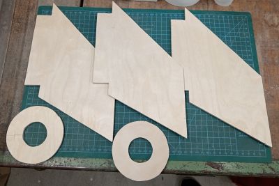 Als nächstes wurden die Flossen aus Rocksim exportiert und gemeinsam mit den Zentrierringen per Laser auf das 5mm Flugzeugsperrholz übertragen. Das klappt übrigens sehr gut und ist für mich eine gute Hilfe.