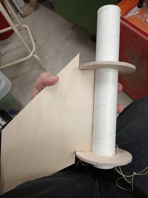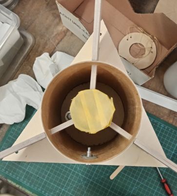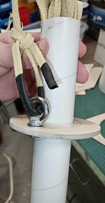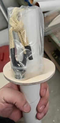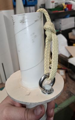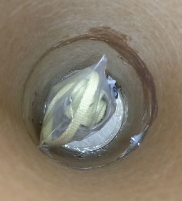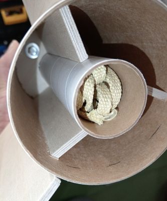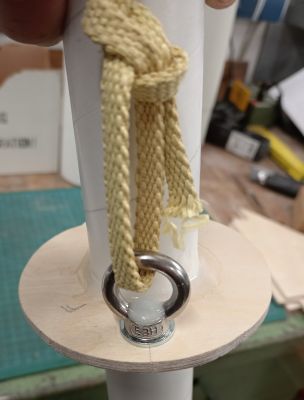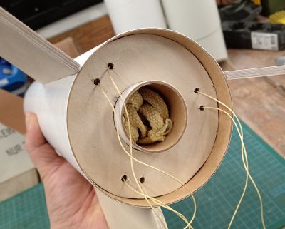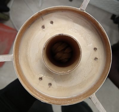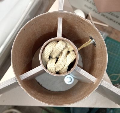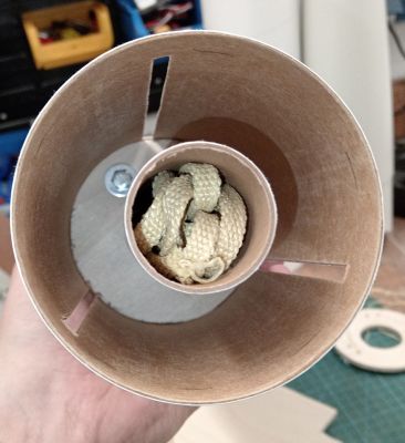 Als nächstes habe ich mich dann an die Motorhalterung gemacht. Die besteht übrigens nur noch aus zwei Zentrierringen (statt ursprünglich drei). Hier habe ich im vorderen Zentrierring den Anker für das Kevlar eingebaut und mit einem Tropfen 5min Epoxy gesichert. Anschließend Habe ich diesen Zentrierring dann mit Epoxi an das Motorrohr geklebt. Noch das Kevlar abgelängt und mit einem Palstek an den Anker befestigt.