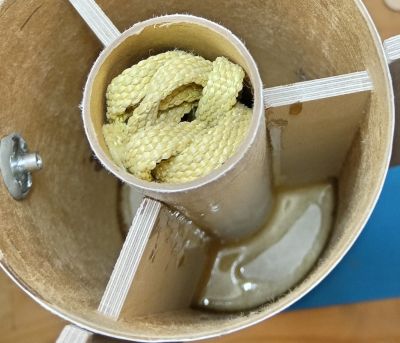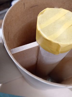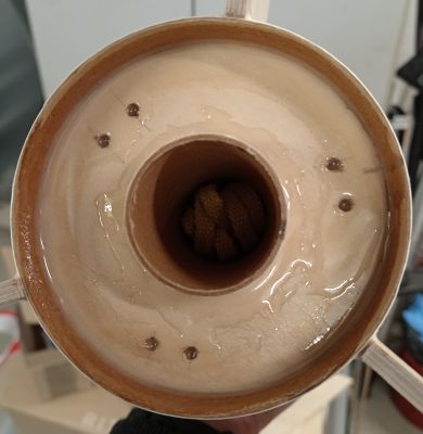 Nachdem sich das Epoxy unten gesammelt hatte, konte ich es -durch Bewegen der Rakete- an den zu klebenden Kanten entlangfließen lassen. Das hat recht gut funktioniert, wenn es auch ein wenig viel Epoxy war...
