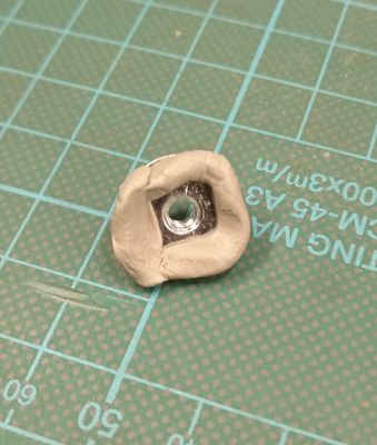 So habe ich dann die Einschlagmutter eingebaut und mit einer Schraube so festgezogen, dass sie in die Knete gedrückt wird, aber ohne dass das Gewinde der Schraube verklebt wird. An meinem Teststück hält das allein schon irre fest. In der Flamingo werde ich noch einen Klecks Epoxy über das ganze geben.