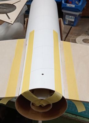 Nachdem das Epoxy gehärtet war, konnte ich die Außen-Fillets vorbereiten. Hierzu habe ich die Flossen und das Körperrohr mit Maskierband abgeklebt um gerade Kanten zu bekommen