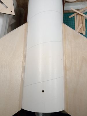 Zunächst habe ich die Aussparungen für die Flossen aus dem Körperrohr geschnitten. Dabei habe ich ein Skalpell mit frischer Klinge und einen Alu-Winkel benutzt. Ging sehr gut, vor allem, wenn man sich Zeit lässt und nicht wie dolle drückt big grin
