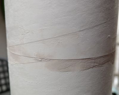 Danach habe ich den Übergang der Rohre etwas nachbearbeitet. Die obere Kante des unteren Rohres hatte etwas durch das arbeiten gelitten. Ich hatte das Unterteil oft auf dieser Kante stehen, daher zeigte sich beim Zusammenkleben ein unschöner Stoß, den ich nun mit Revell Plasto versucht habe zu spachteln. Danke hier nochmal an Benni, der mir das Plasto erklärt und quasi empfohlen hat. Ich will später noch die Spiralen am Körper damit füllen.