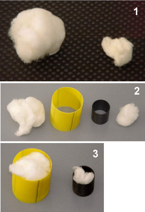Mit wenig Watte anfangen und langsam steigern, bis das Bergungssystem grade zuverlässig ausgestossen wird. Jetzt wird die doppelte Menge genommen und getestet. Es wird anständig knallen. Die Zelle muss das aushalten, sonst hat sie nichts getaugt. Aus diesen beiden Mengen nimmt man den Mittelwert als engültige Dosierung. Da man so kleine Mengen Pyrowatte schlecht wiegen kann, ist es am besten, eine gleich große Menge Kosmetikwatte mit einem Vermerk der jeweiligen Rakete zu archivieren. Dann weiss man auch noch nach einem Jahr, welche Menge zu welcher Rakete gehört. Das Aufnahmerohr in der Rakete muss vom Durchmesser und der Länge her zu der Wattemenge passen, so dass die Watte ohne Kompression locker reinpasst.