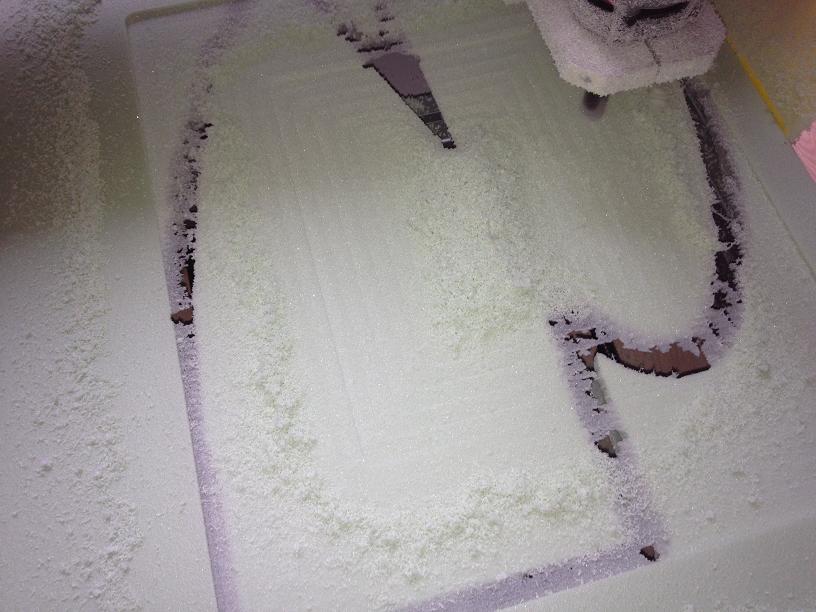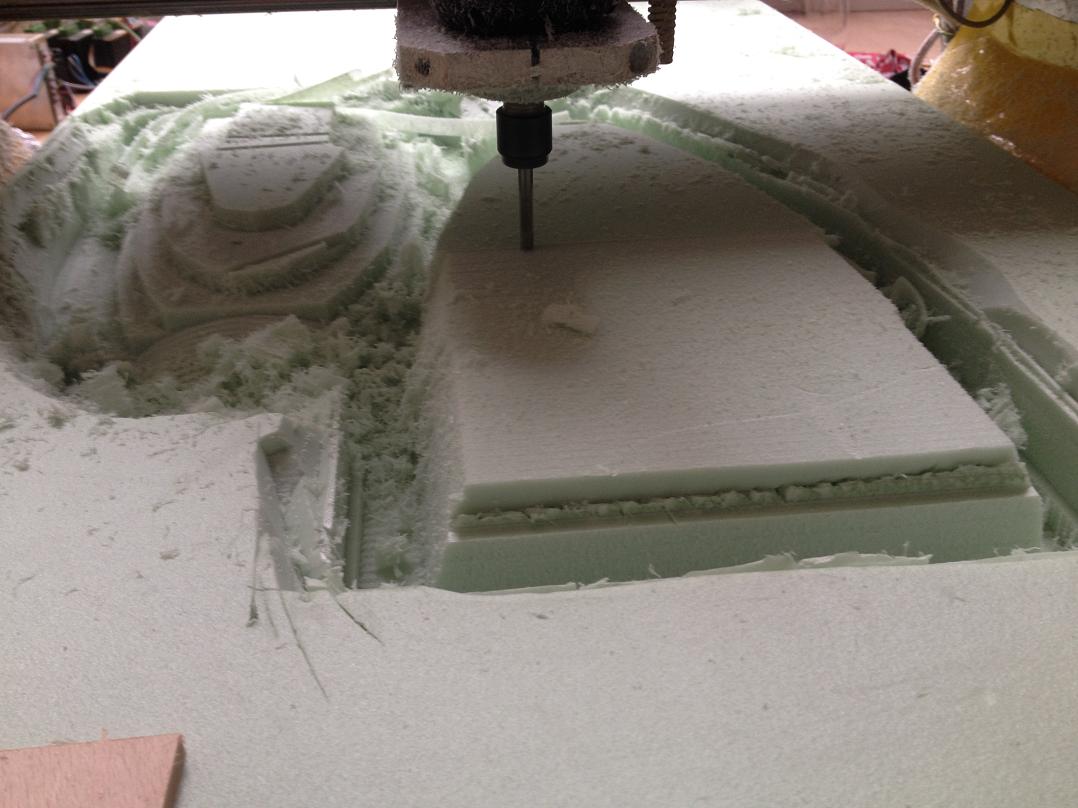 Gestern ist das Styrodur gekommen, habe ich bei sansys.de bestellt. Die Qualität ist sehr gut, relativ fest, im Vergleich zu den rosa Baumarktplatten. Also auf die Fräse damit, und 1,5 Stunden viel Dreck machen: noch ne halbe Stunde, dann habe ich ein Ergebnis. Der Fräser ist relativ am Ende mit der Eintauchtiefe, aber es geht noch. Gruß Fabian