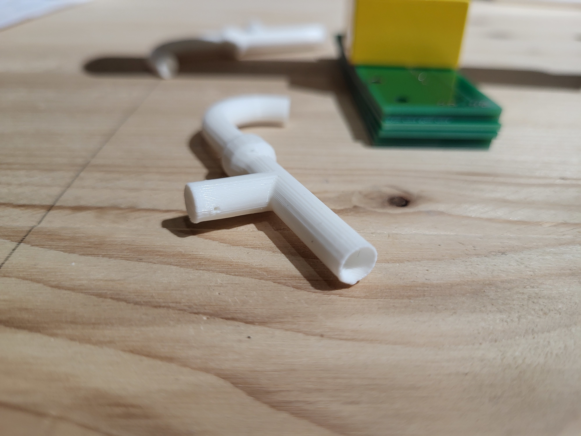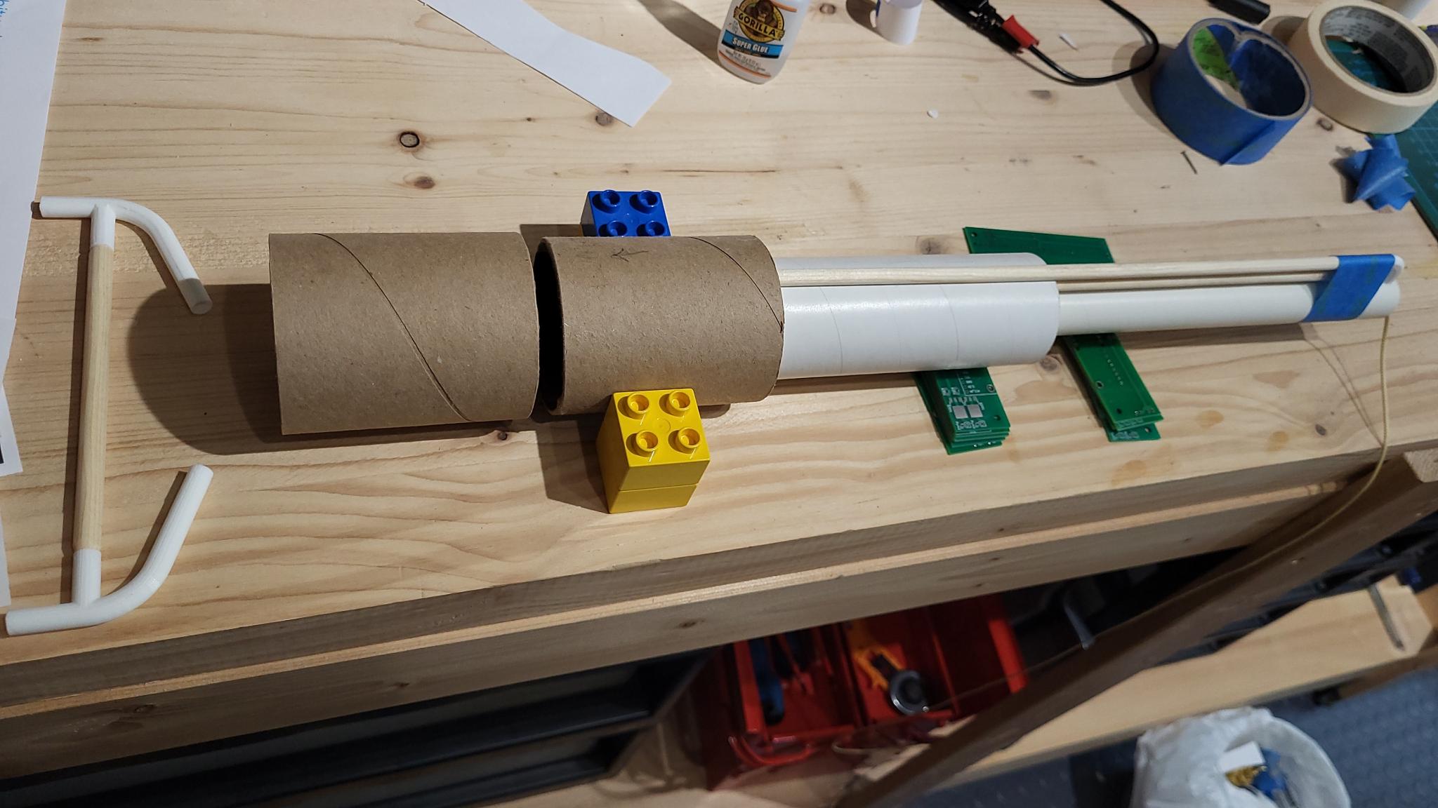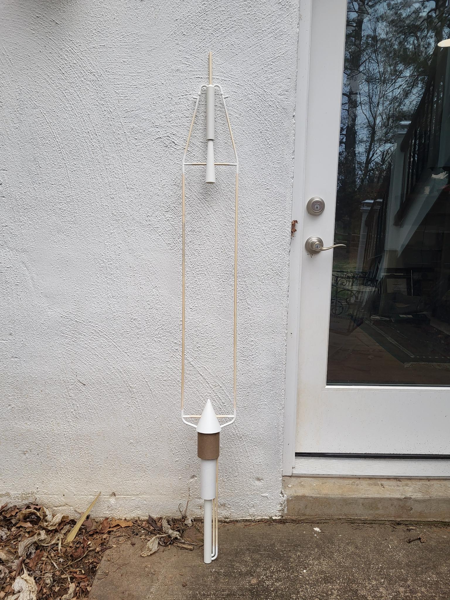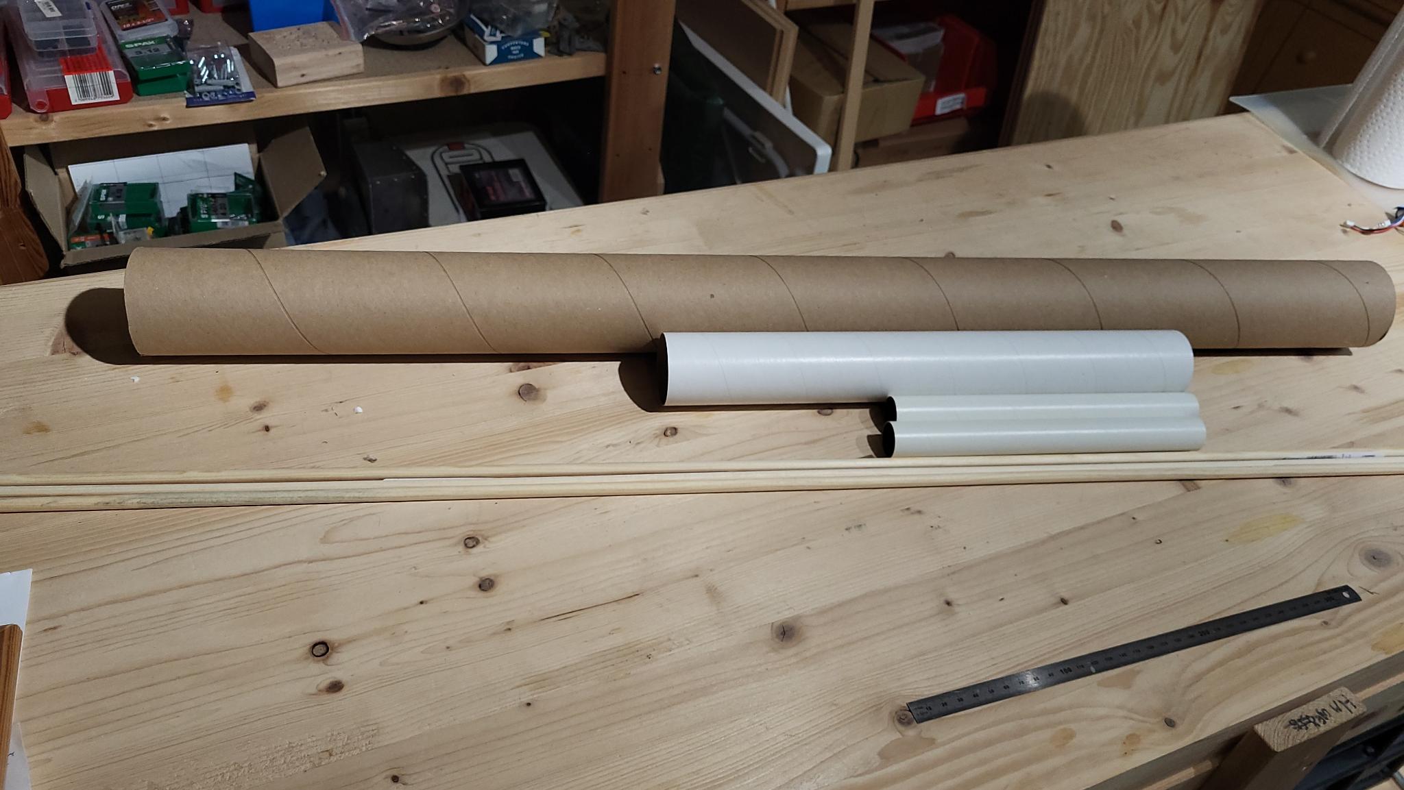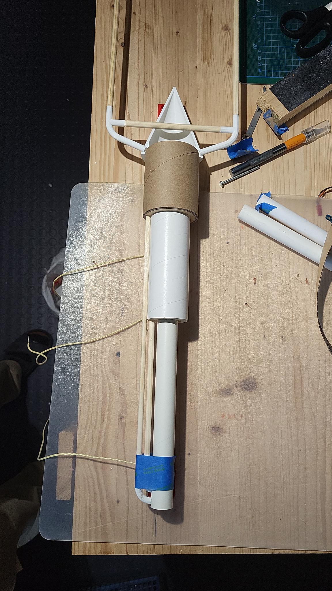 Ausgangspunkt waren die wenigen Fotos die es von der Rakete gibt und eine Zeichnung von Pete Alway aus "Retro Rockets" (welches ich leider noch nicht besitze), die man unter https://archive.org/details/SPD-SLRSY-2229 finden kann. Wenn man sich die Abmessungen so anschaut ist Maßstab 1:2 naheliegend. Die notwendigen Rohrdurchmesser sind dann 1 in (25 mm), 2 in (50 mm) und 2,75 in (~70 mm). BT-50 ist ja gängig, von 50-mm-Klima-Rohr hatte ich auch noch ein gutes Stück, und die Dampfsperre vom Neubau gegenüber vor ein paar Jahren kam auf 70-mm-Rohren. Für die Rohrverbindungen habe ich ein wenig überlegt (Kunststoff wie beim Estes-Bausatz? Kohlefaser?) und mich dann für Holzstäbe entschieden, die es hier in verschiedenen zöllischen Durchmessern gibt. Statt 7/32", 1/8" und 1/4" habe ich die Durchmesser etwas größer gewählt und für die im Original unverkleideten Metallrohre 1/4" (~6,5 mm) und für die asbestverkleideten 5/16" (~8 mm) genommen. Ich habe alle Massen grob hochgerechnet und bin bei rund 400 g gelandet. Mit 24 mm Motordurchmesser hatte ich dann ein paar gute Kandidaten im E- und F-Bereich. Wenn mein Händler keine E30T-4 Single Use bereit hätte, könnte ich zur Not immernoch auf einem E28T- oder F39T-Reload fliegen. Dieser Haufen Rohre und Holzrundstäbe war also die Ausgangslage. Die Rohre zurechtgeschnitten, aus einem Stück des großen Rohres einen Kuppler hergestellt und die ersten 3D-Druck-Teile fertig. Der untere Teil, im Original sind das Benzin- und Sauerstoff-Tanks, lässt sich schon erkennen. Der Querstab links wird später unter dem Strahlabweiser verschwinden und dient außerdem zum Einhängen des Schockbands. Fallschirm und Schockband werden im Kuppler und dem mittelgroßen Rohr untergebracht. Ich habe diesen Teil nicht besonders originalgetreu nachgebildet, da ich den Motor unten einsetzen wollte und die genaue Verbindung zwischen den einzelnen Tanks auf Fotos und Zeichnungen etwas unklar war. Laut Patent ist da auch irgendwo ein Alkoholbrenner zur Druckerzeugung in den Tanks - den brauchte ich ja definitiv nicht. Die Verbindungsstücke für die Holzstäbe sind mit 100% Infill 3D-gedruckt, mit 30°-kegelförmigen Aussparungen. So konnte ich die Holzstäbe einfach mit einem Anspitzer für die Verklebung vorbereiten und ich konnte mich leicht an die notwendige Länge herantasten. Den Übergang zwischen Kunststoff und Holz habe ich mit Holzspachtel geglättet. |