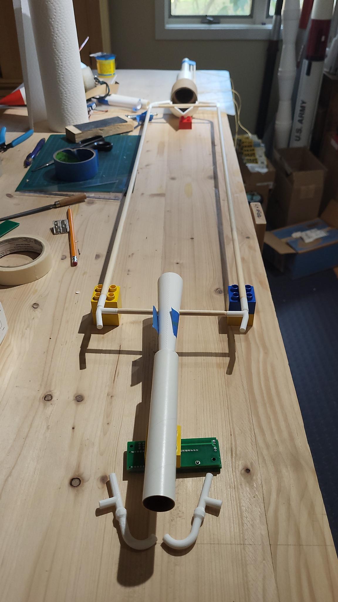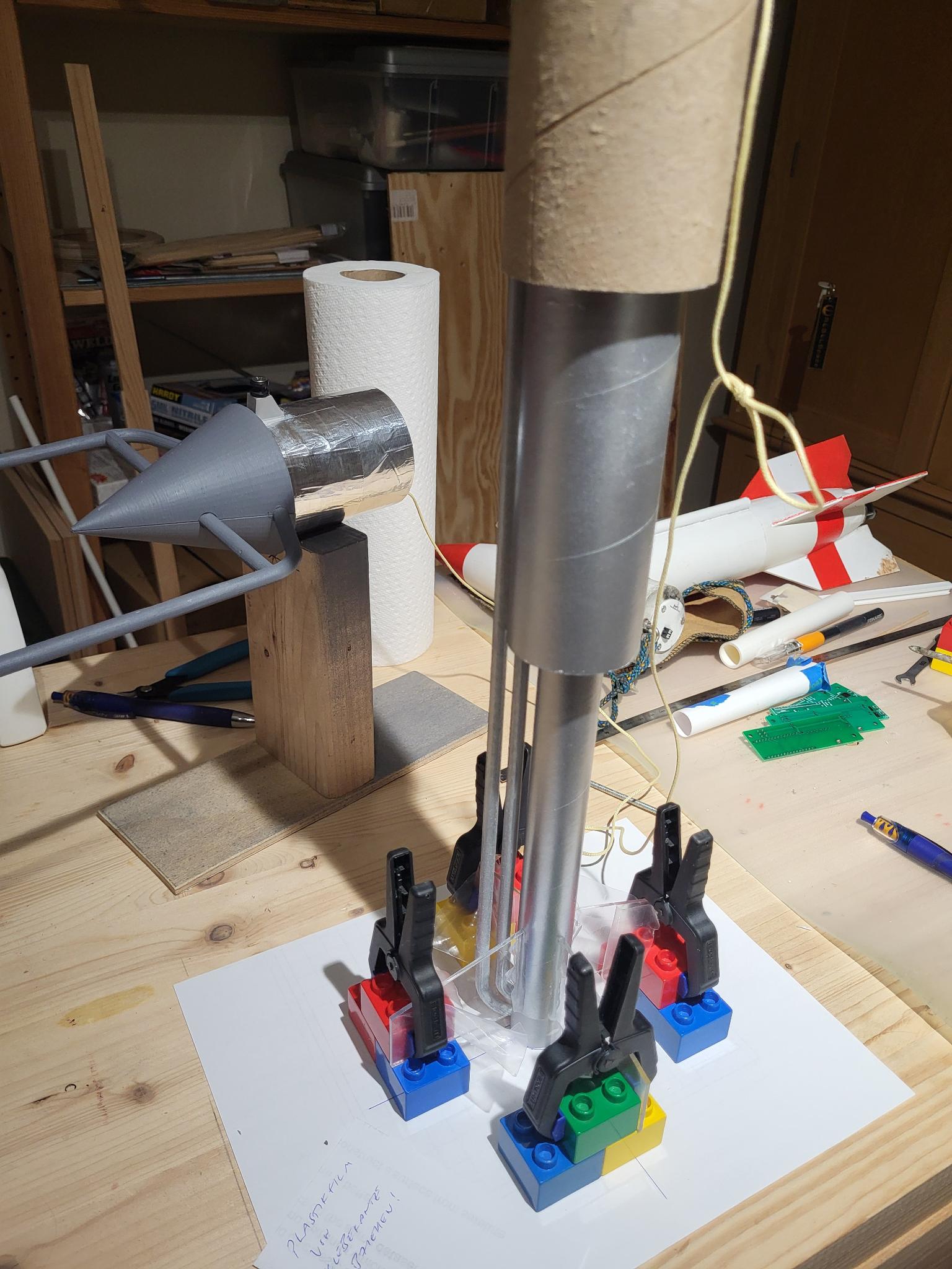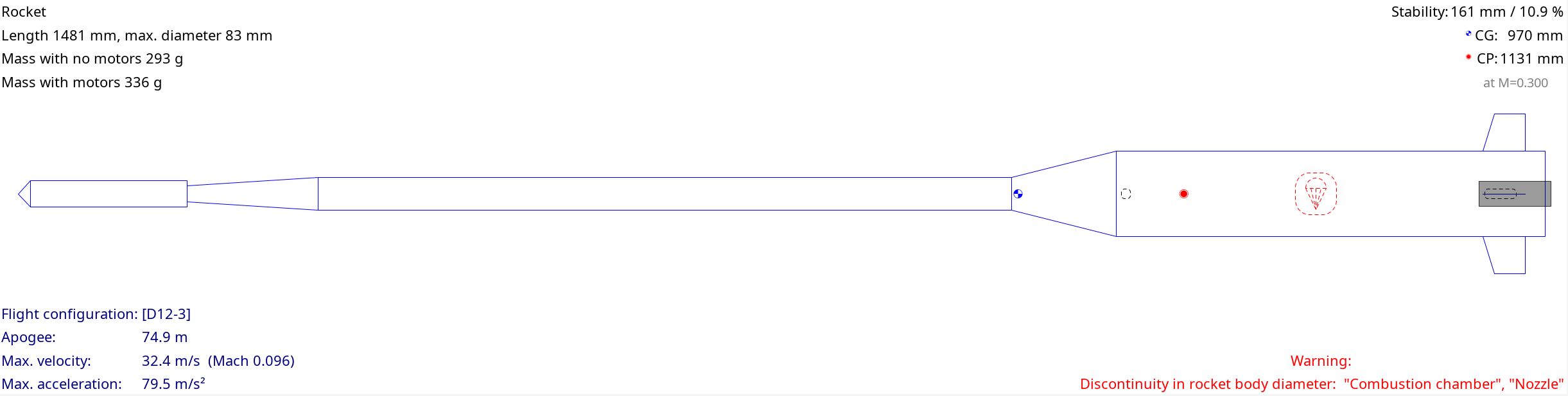 Um richtig fliegen zu können braucht die Rakete natürlich noch Rail Guides und Flossen. Ich habe verschiedene Simulationen mit OpenRocket durchgeführt, um die konservativste Druckpunktlage zu finden. Die Strömung könnte z. B. nach dem Strahlabweiser und den abgestuften Rohren nicht am hintersten Rohr anliegen, in der Simulation habe ich also ein Rohr mit dem Durchmesser des Strahlabweisers bis zu den Flossen weitergeführt und nur den überstehenden Teil der Flossen simuliert. Auch damit hat die Rakete noch eine Stabilität von ca. 11%, das sollte auf jeden Fall reichen.