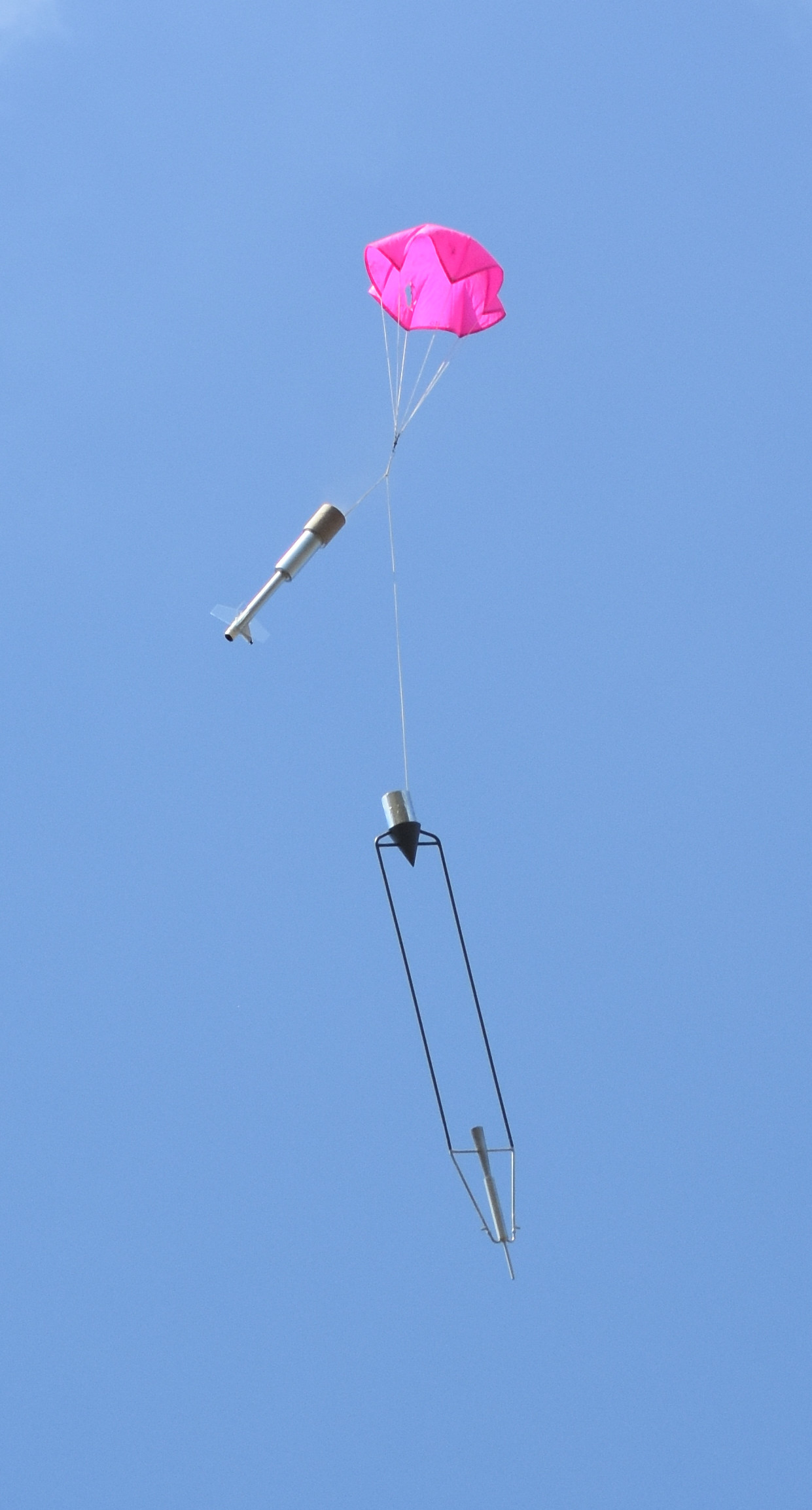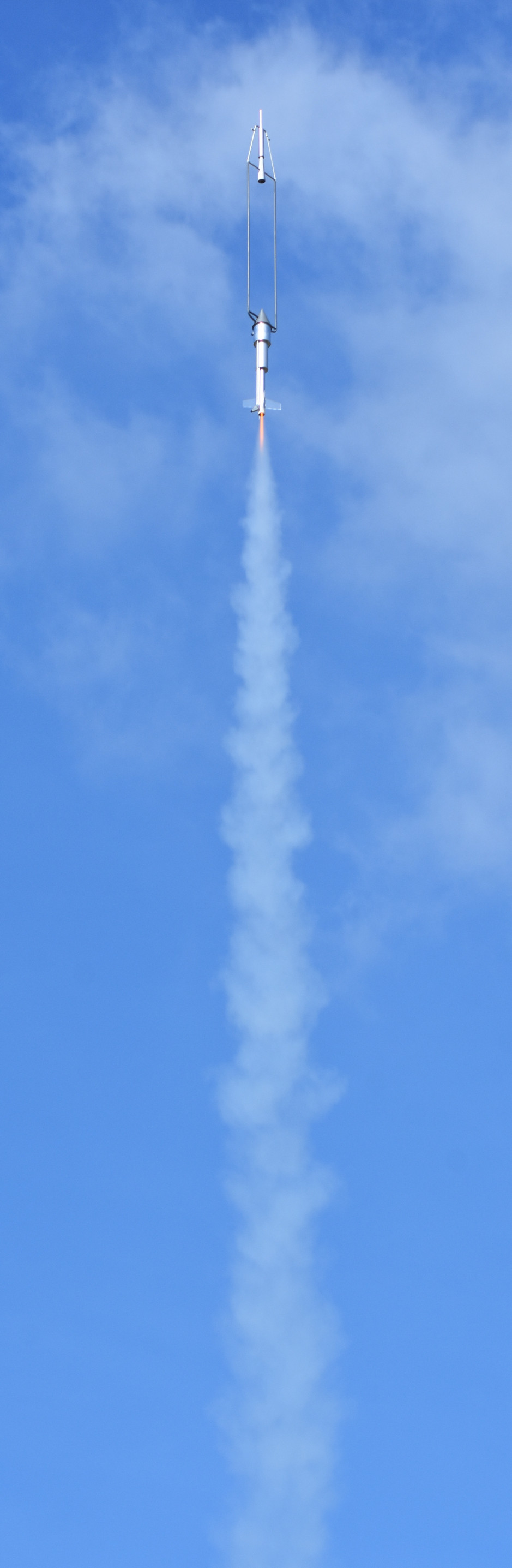 Die Rakete kam gut aus der Rail und flog mehr oder weniger gerade nach oben. Fallschirm kam zum richtigen Zeitpunkt. Nach der Landung war die Verklebung der Holzstäbe am oberen Ende gebrochen, und eine Flosse ist verschollen. Theoretisch könnte ich sie wieder fliegen, vielleicht dieses Mal auf einem E-Motor, aber jetzt hängt sie bei mir überm Schreibtisch an der Wand. Oliver |