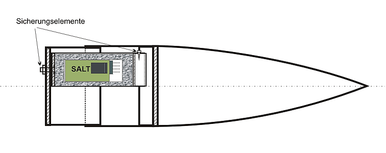 Hallo Tom, das kann man sicher machen. Spitze, Saltkammer und Körperrohr sollten mit Leinen verbunden werden. Der Salt selbst ist in dem Schutzrohr eigentlich sicher aufgehoben. Dieses ist unten am Spant der Saltkammer verschraubt und oben mit einem seitlich gesicherten Deckel verschlossen. Der Salt sitzt in dem PU-Schaum. Er hat keinerlei Befestigungsbohrung. Deshalb bin ich zu dieser Lösung gekommen. Hier nochmal eine Skizze: Gruß Andreas