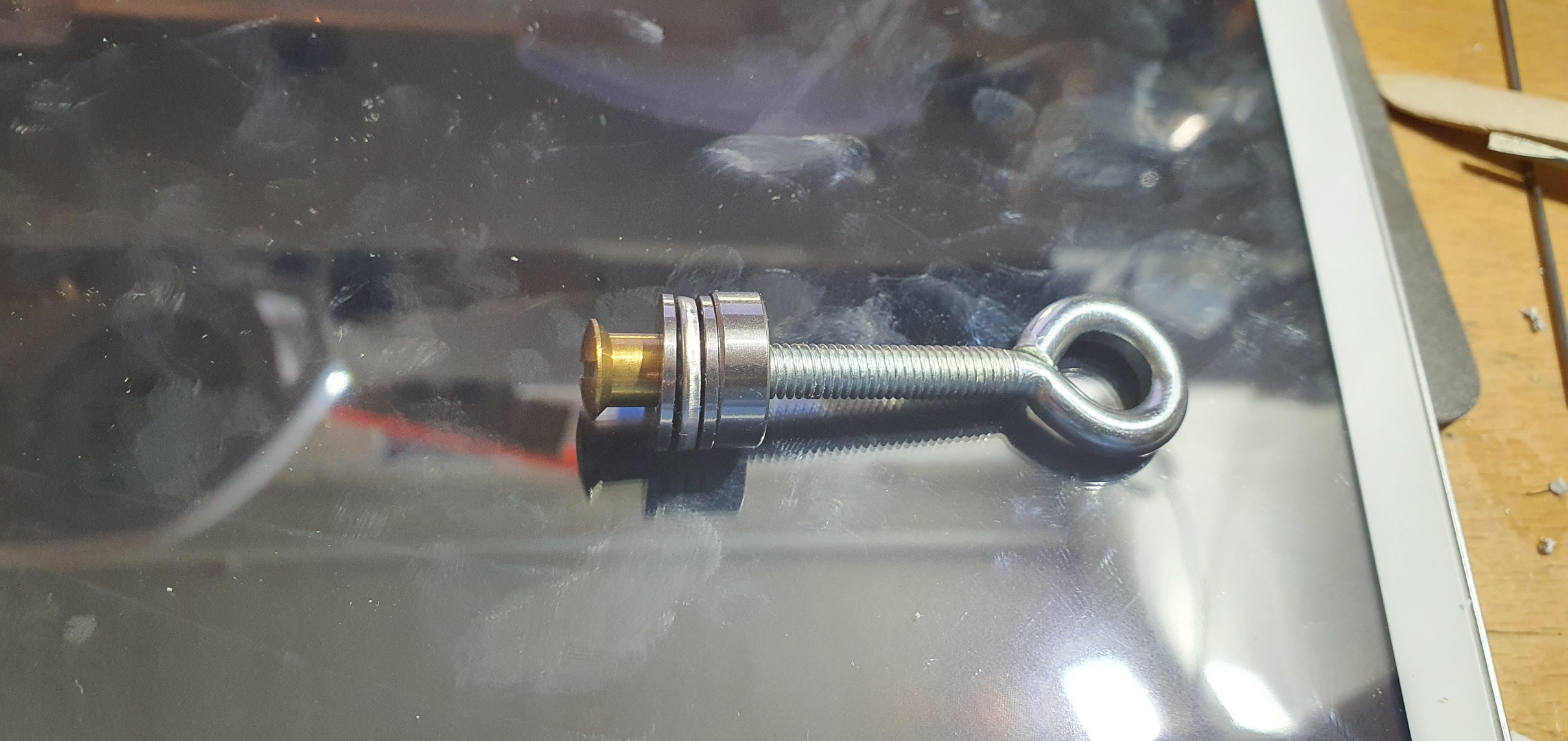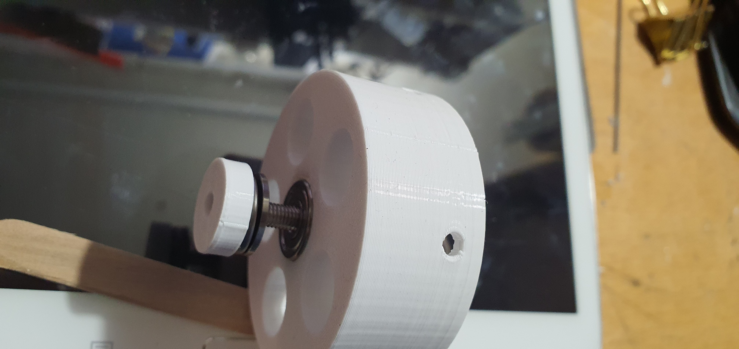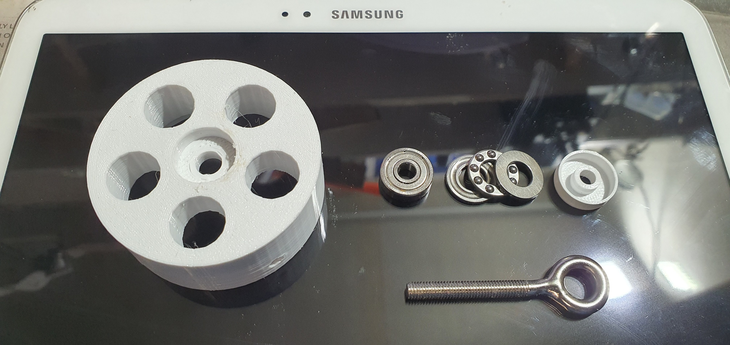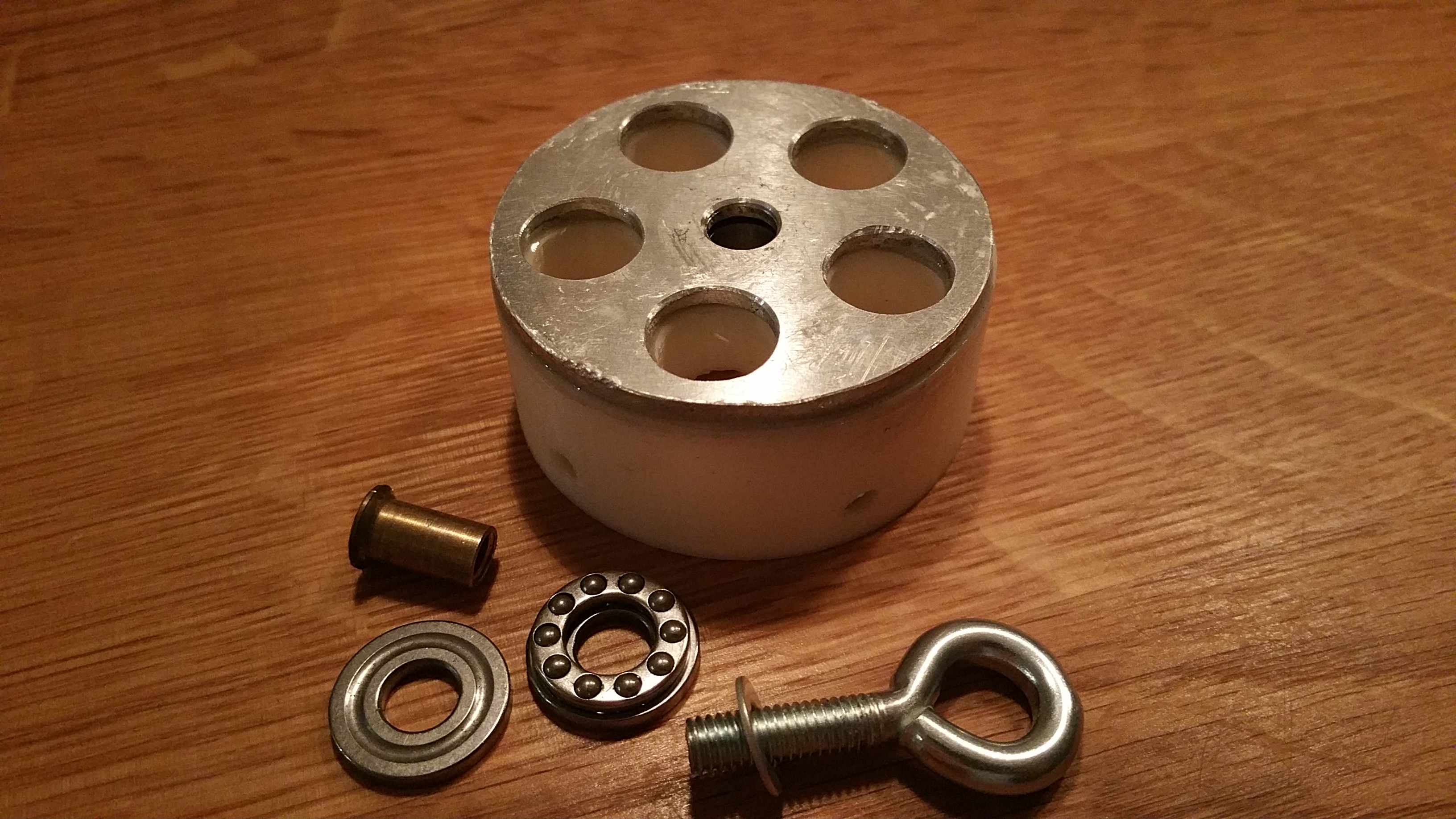 Die weiße Kappe ist nur der Tatsache geschuldet, dass ich an Statt einer M6 eine M5 Ringe-Schraube genommen habe aber kein kleineres Axiallager hatte.