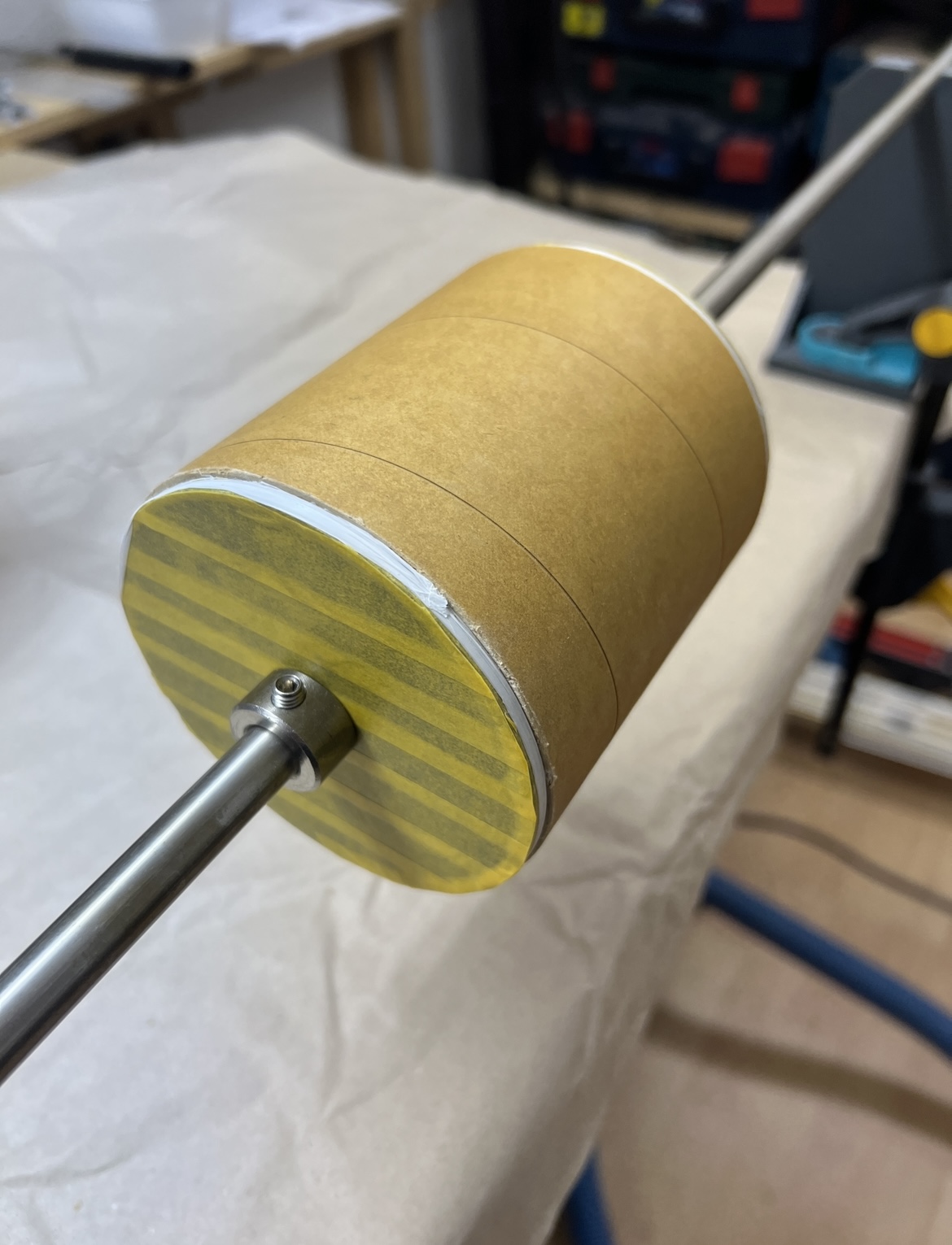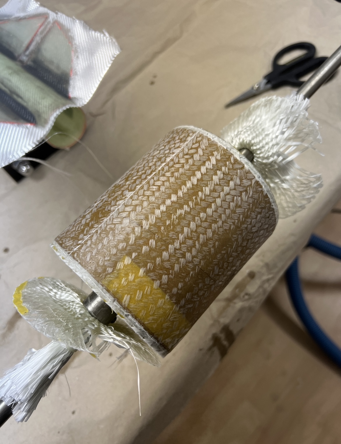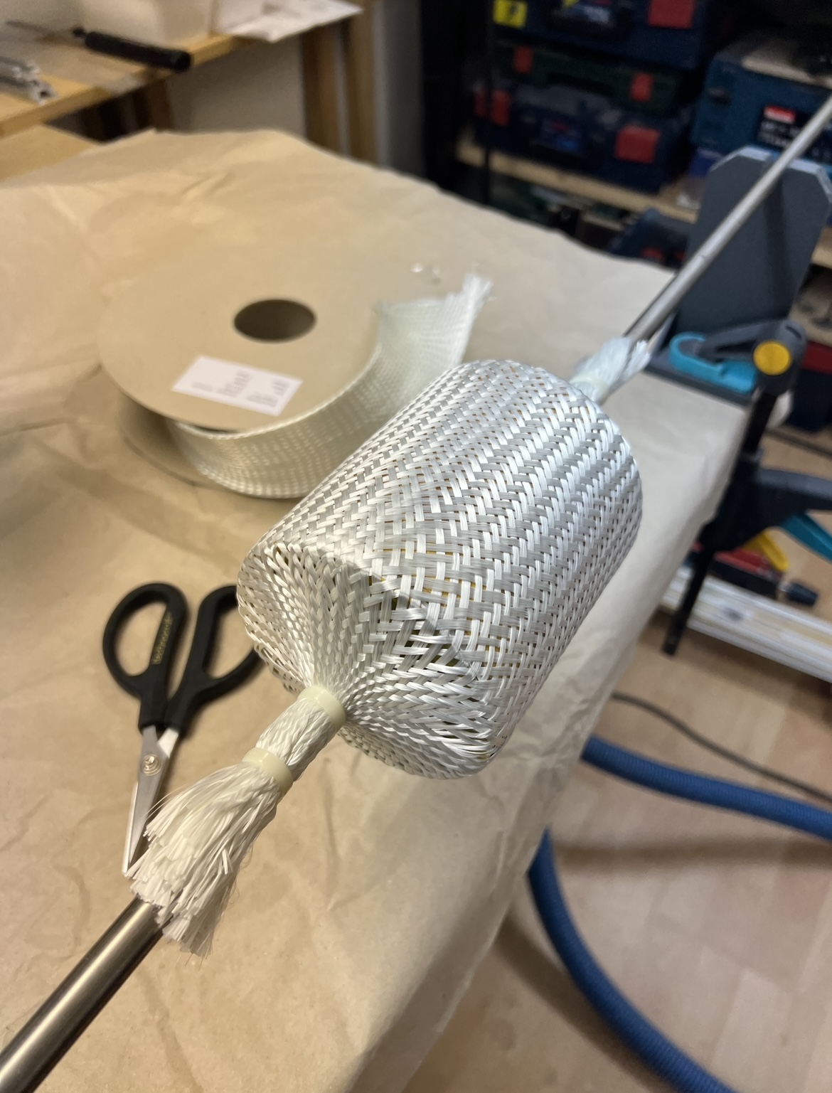 So heute hab ich mal ganz quick und Dirty den Gewebeschlauch getestet … Rohr auf meine Vorrichtung gepackt … Gewebeschlauch drüber … hier muss man später echt aufpassen diesen nicht zu „verziehen“ Dann mit Harz getränkt und Schrumpfschlauch drüber … Bin sehr gespannt wie es sich mit der Festtigkeit verhält, wie die Oberfläche ausschaut und wie viel mehr das ganze wiegt … Update dann morgen nach dem Aushärten …