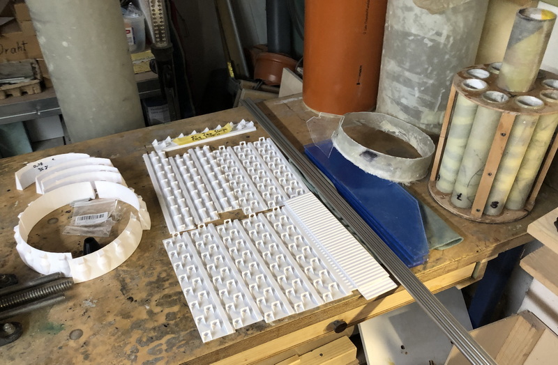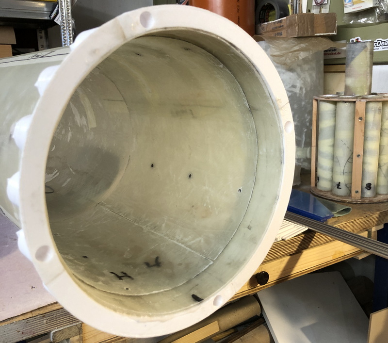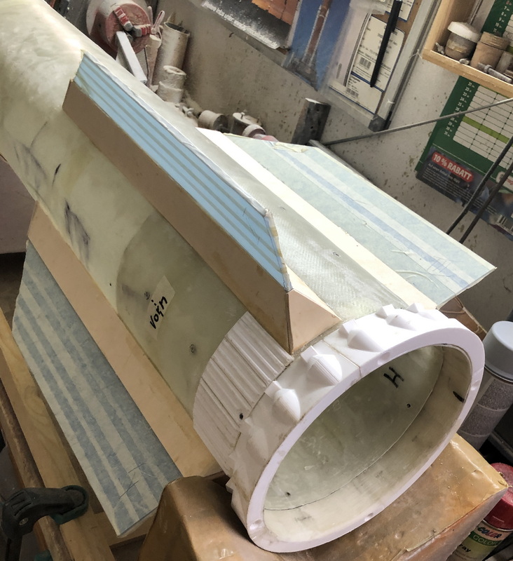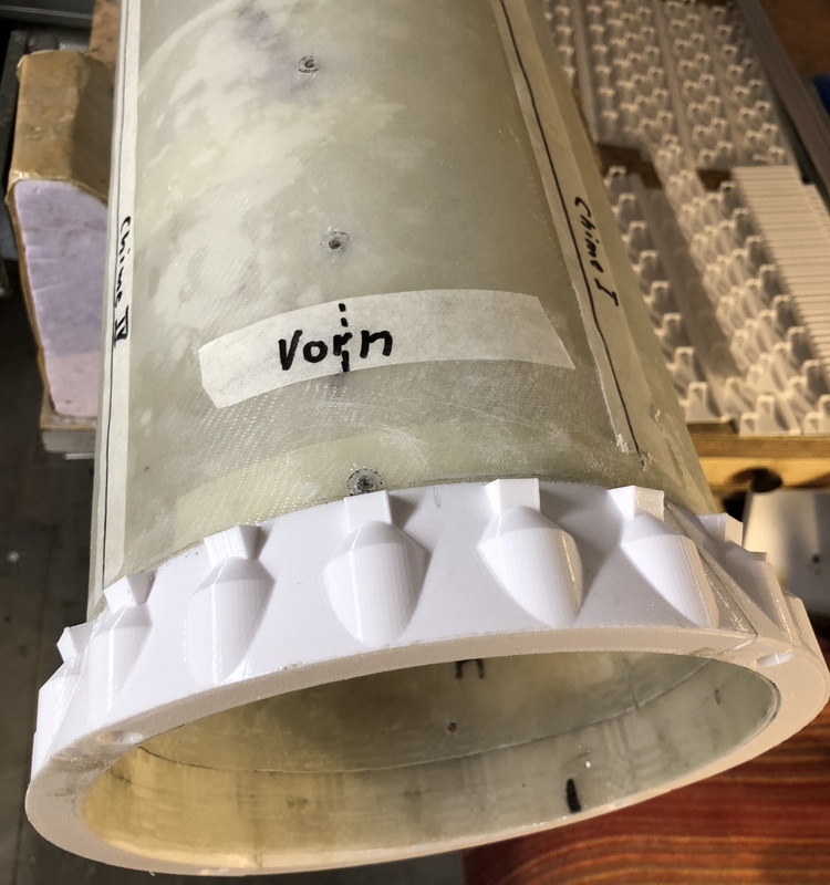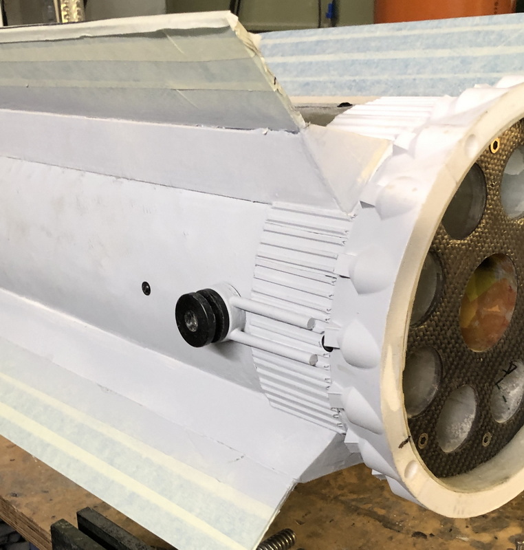 Mittlerweile sind alle 4 Chines mit ihren Acrylhilfsflügeln anmontiert und den Clusterblock habe ich auch wieder eingebaut. Auf der Rückseite habe ich schon mal ein bisschen mit dem Spritzspachtel gespielt. Der Railbutton ist so weit erhöht, dass das Rail knapp über den Düsenkranz drüber gehen wird. Hoffen wir mal. Bis auf weiteres, Ciao, Rolli