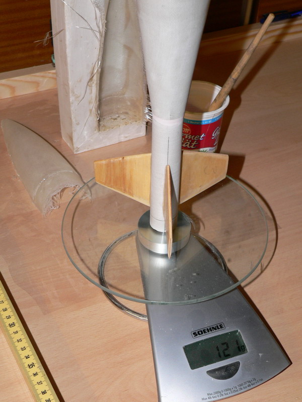 Andreas, ich habe zwar nur zwei Lagen Gewebe genommen, aber das war das dicke 180er. Aus Fehlern lernt man ja bekanntlich Meine Spitze ist letztlich 40g schwer geworden. Ehrlich, für mich ist das schon federleicht. Die ganze Rocket wiegt so wie sie daliegt 170g. Aber ich werde es nochmal versuchen. Ich strebe da unter 100g an. Wie ich schon fast ahnte, ist das für mich eine echt schwere Anstrengung so leicht wie nur möglich zu bauen. Auf Dauer wird mich das aber nicht befriedigen. Ciao, Rolli