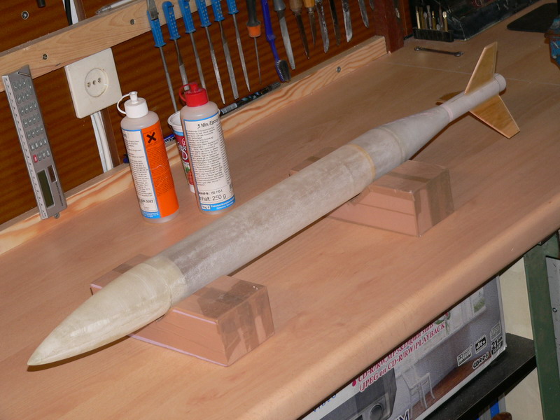 Hi Leute, außer der Spitze ist mein erstes S1D-Modell im Rohbau fertig. Leider werde ich da wenig Chancen haben, da - wie sollte es bei mir anders sein - zu schwer. Ohne Spitze wiegt die Rocket schon 120g  Für die Spitze noch mal 50g dazu, bin ich mit mit 170g Leergewicht wahrscheinlich Bummelletzter. Na ja, dafür aber wieder voll GFK. Die kann ich sogar bei strömenden Regen, oder unter Wasser starten. Ich als Rocketschwergewichler muß mich halt erst an das zarte, zerbrechliche Modellendprodukt heran arbeiten... ciao, Rolli