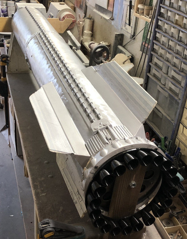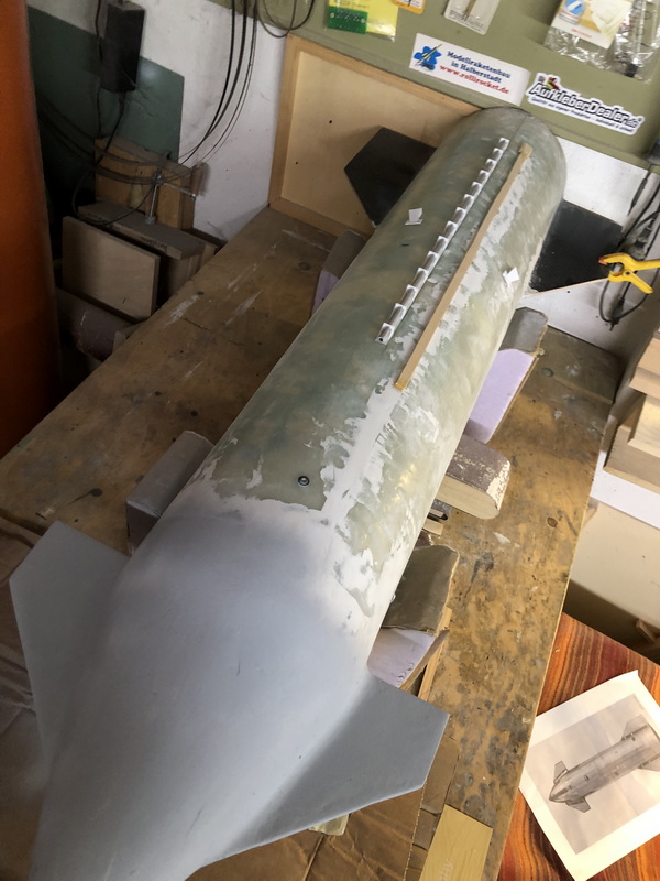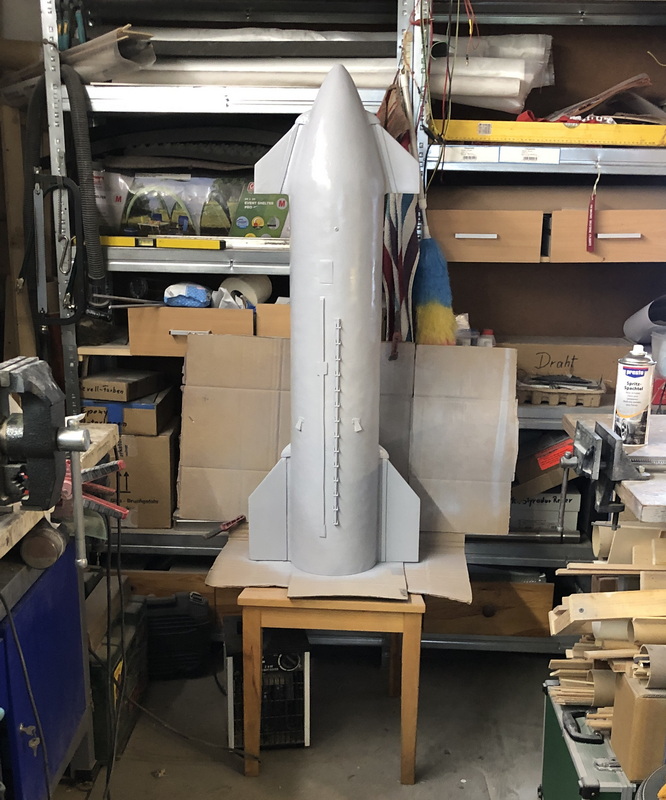 Nachdem ich den Booster wieder drehbar gelagert hatte, habe ich mich getraut zu lackieren. Wenn er trocken ist gehe ich nochmals drüber. Die Scaleelemente vom Starship sind nun ebenfalls draufgeklebt. Ciao, Rolli