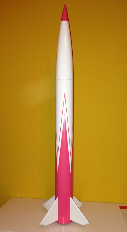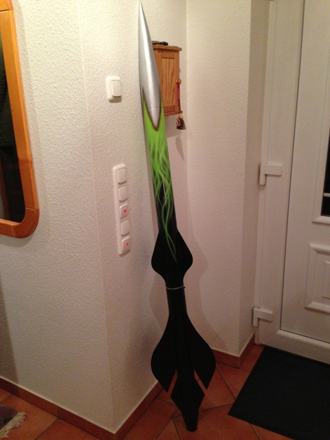 braucht max. 29 mm Lippenstift mit Perchloratpuder. 57mm Konfektionsgröße, Körpergröße ca. 65 cm. Gewicht.. eh viel zu fett, hehe. Fin through body, PML Rohr und Spitze, Papp-Motorrohr, Alu-Schraubretainer von Holger, Fallschirm auch.