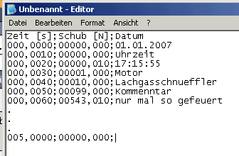 ich würde ein Format wählen was auch excel verstehen kann. Es kann z.B. so sein, das die Spalten durch ein";" getrennt werden und zeilen durch einen Zeilenumbruch. Die Datensätze sind in Klartext abgelegt, das bedeutet, man kann das auch mit irgendeinem Editor öffnen und sofort die Tabelle lesen. Man sollte auch ein Format vorgeben wie Zahlen geschrieben werden. Jetzt kommt ein Problem hinzu. Die Samplerate. Je höher desto besser, doch haben einige Programme Probleme eine Kruve mit einigen tausend Punkten zu lesen. Manchmal wird sogar nur eine stilisierte Kurve abgelegt. Aber ich denke das ist ein Problem der Software. Evtl. muss eben ein Übersetzter gerschrieben werden. Hier mal ein Beispiel Wie man sieht, kann man alles lesen. Die Einheiten sind Sekunde und Newton. Neben den Spalten mit den Zeitwerten und dem Schub, ist eine Spalte wo von oben nach unten alles weitere rein geschrieben werden kann. Z.B: sowas wie Motordaten oder Daten zu der Messung. Da diese daneben stehen, ist das Format gleich so, das Excel das lesen kann oder auch jedes andere Programm. Da führende und folgende Nullen ausgeschrieben werden, kann man selber mit einem einfachen Programm die Daten heraus suchen die man braucht. Die Anzahl der Vor- und Nachkommastellen sollte reichen oder? Bei sehr hohen Sampleraten kommt man schon mal in den Bereich der 1/10.000 Sekunde. mN für die Kraft sollte auch reichen. Bei den Zusatzdaten sind Infos über Samplerate und Kraftaufnehmer Genauigkeit wichtig. Gruß Neil Geändert von Neil am 06. Oktober 2006 um 14:33 Die Erde ist eine Scheibe. Egal in welche Richtung sich die Menschheit bewegt, sie geht immer auf einen Abgrund zu. |