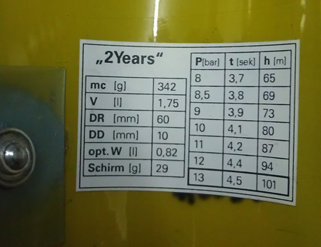 Die Drücke waren Flug 1: 9 bar Flug 2: 8 bar Flug 3: 10 bar Volumen der Rakete: 1,75 l Rakete und Schirm wiegen zusammen 371 g Die erreichten Höhen passen ganz gut zu den Werten, die ich mit meiner App berechne. Eure 130 m sind ja auch schon ganz ordentlich. Gib mir doch mal die Daten von Deiner Rakete (Volumen, Leergewicht, Gewicht Schirm, Durchmesser Rakete, Durchmesser Düse, Wassermenge). Mal gucken, was meine App bei 10 bar sagt. Grüße Marcel Geändert von WARAausKIEL am 07. April 2015 um 21:34 If You Don't Try, You'll Never Know |