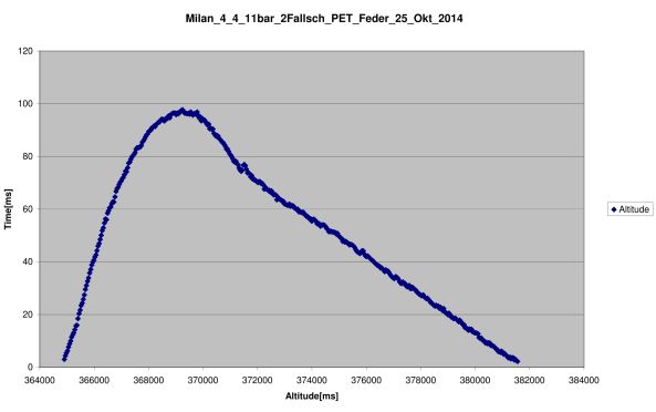 Er wurde mit meiner Milan 4.4, einer Wasserrakete von 4,4 ltr aus 1-Literflaschen geflogen. An Bord waren 2 Fallschirme (Vorschirm im Gipfel, Hauptschirm bei 60 m). Ich war mutig und nahm zum Vergleich auch den Altimax! G3 mit ( in einem stabilen Rohr). AltiWR stellte eine Höhe von 96 m fest, Altimax! dagegen 103 m. Hier das von Excel aus den Flugdaten ermittelte Diagramm: Aus dem Altimax! konnte ich nur die maximale Höhe, aber keine weiteren Flugdaten auslesen; warum, bleibt noch zu klären. Die Sinkgeschwindigkeit ist mit 7,4 m/s relativ hoch. Grund ist, dass der Altimeter den Hauptschirm zwar auslöste, der Arretierungsstift des Servos aber noch ein wenig herausragte (neu gebaute Fallschirmkammer), so dass es nicht zur Auslösung kam. Zusammenfassend lässt sich also sagen, dass AltiWR seinen Zweck erfüllt, der Drucksensor BMP180 aber offensichtlich nicht die Genauigkeit z. B. des Altimax! G3 erreicht. Achim Tracking https://www.dropbox.com/scl/fo/zap4uvchueg080w0az5og/AOOqAeAiN2aSaAEPhiusKyk?rlkey=cuvsp1db08mrwq20gqqbpicg2&dl=0 Altimeter https://www.dropbox.com/sh/jw1nenfd45mzee3/AABZKjSB-_9DA-pLaVlOti-9a?dl=0 |