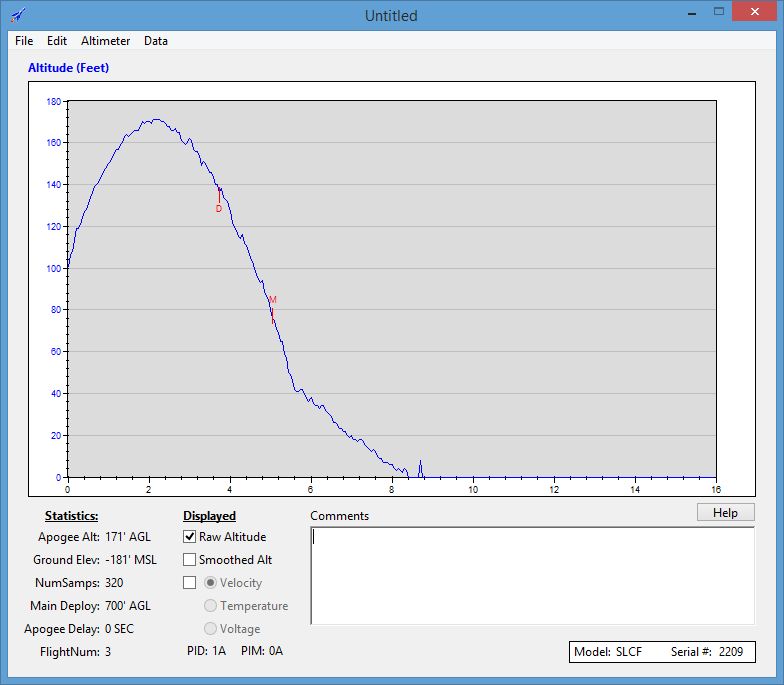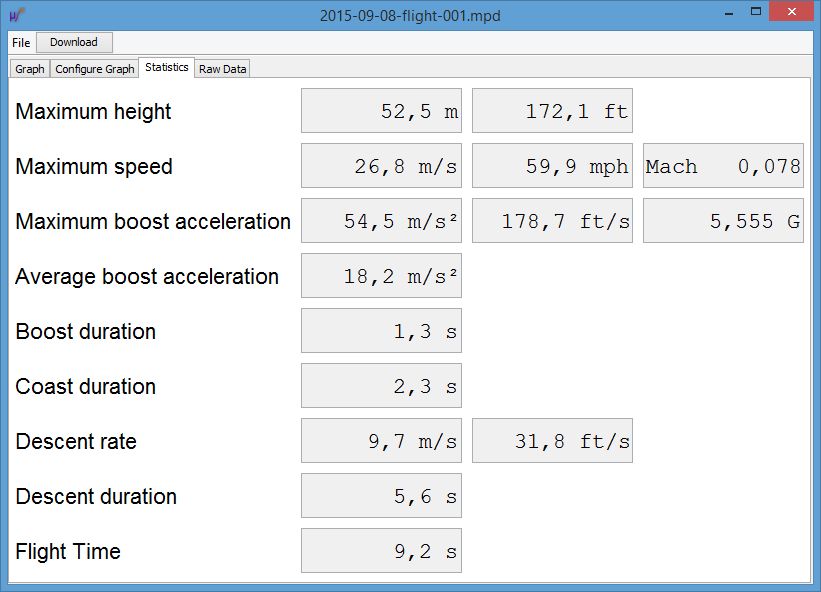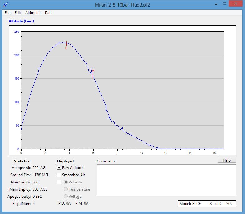 - PerfectFlite Stratologger CF - Altus Metrum MicroPeak verhält. AltiWR gab im ersten Fall die erreichte Höhe mit 52,14 m an: Der Stratologger ermittelte 171 Fuß entsprechend 52,13 m: Der MicroPeak kam auf 52,5 m: Im zweiten Fall gab AltiWR die Höhe mit 68,82 m an: Der Stratologger kam auf 226 Fuß entsprechend 68,90 m: Damit bin ich schon mal sehr zufrieden, denn die Abweichungen sind geringer, als die vom Hersteller angegebene Genauigkeit der Sensoren es erwarten lässt. Natürlich wäre auch ein Vergleich bei größeren Höhen sinnvoll. Tracking https://www.dropbox.com/scl/fo/zap4uvchueg080w0az5og/AOOqAeAiN2aSaAEPhiusKyk?rlkey=cuvsp1db08mrwq20gqqbpicg2&dl=0 Altimeter https://www.dropbox.com/sh/jw1nenfd45mzee3/AABZKjSB-_9DA-pLaVlOti-9a?dl=0 |