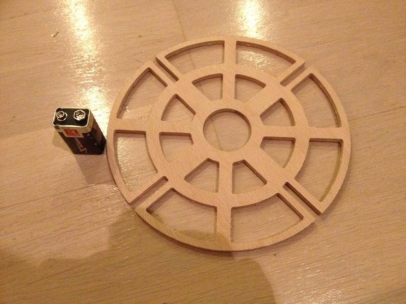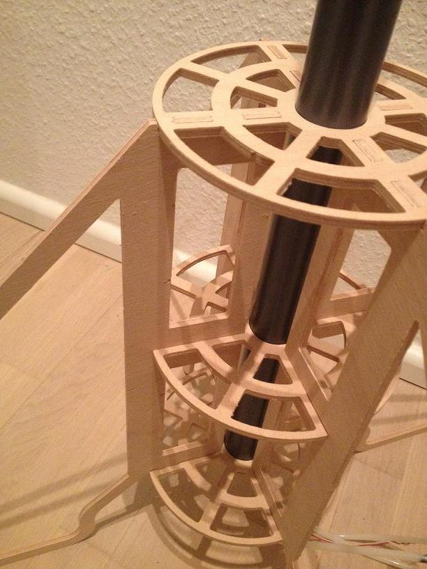 Gestern wurden die Kanten der Rohre noch mit Cyanacrylat getränkt und geschliffen, so sind diese auch hart und fransen nicht mehr aus. Heute war dann wieder Maschinentag. Die restlichen drei Spanten und Finnen wurden gefräst. Die Stege, die ausgefräste Inseln an Ort und Stelle halten, wurden etwas größer gemacht als zuvor. Beim ersten Spant sind einige Teile herausgeflogen. Wer mit dem Fräsen anfängt sollte erstmal große Stege machen. Wenn sich ein Teil löst und der Fräser kollidiert, hat man sehr schnell Schrittverluste und das Bauteil ist hin oder der Fräser bricht ab! So schaut dann eine fertige Platte aus:  Habe inzwischen gute Parameter für das Holz gefunden. Ich habe nur die Stege mit einem Cuttex abgeschnitten, sonst nichts entgratet: So schaut die komplette Motor-/Finnenhalterung aus. In der Mitte der Hybrid, um zu sehen ob wirklich alles passt: Auf den geschlitzten Ring unten kommt ein kleiner Heizlüfter, der den Hybridtank auf Temperatur hält. So ist der volle Druck beim Start da. Noch ein Blick auf die Steckverbindungen: Bei 4 Finnen, die unten überstehen habe ich es von Hand nie geschafft, dass alle flächig und winklig aufliegen. Mit der CNC-Fräse kein Problem, das kippelt nichts. Gruß Fabian