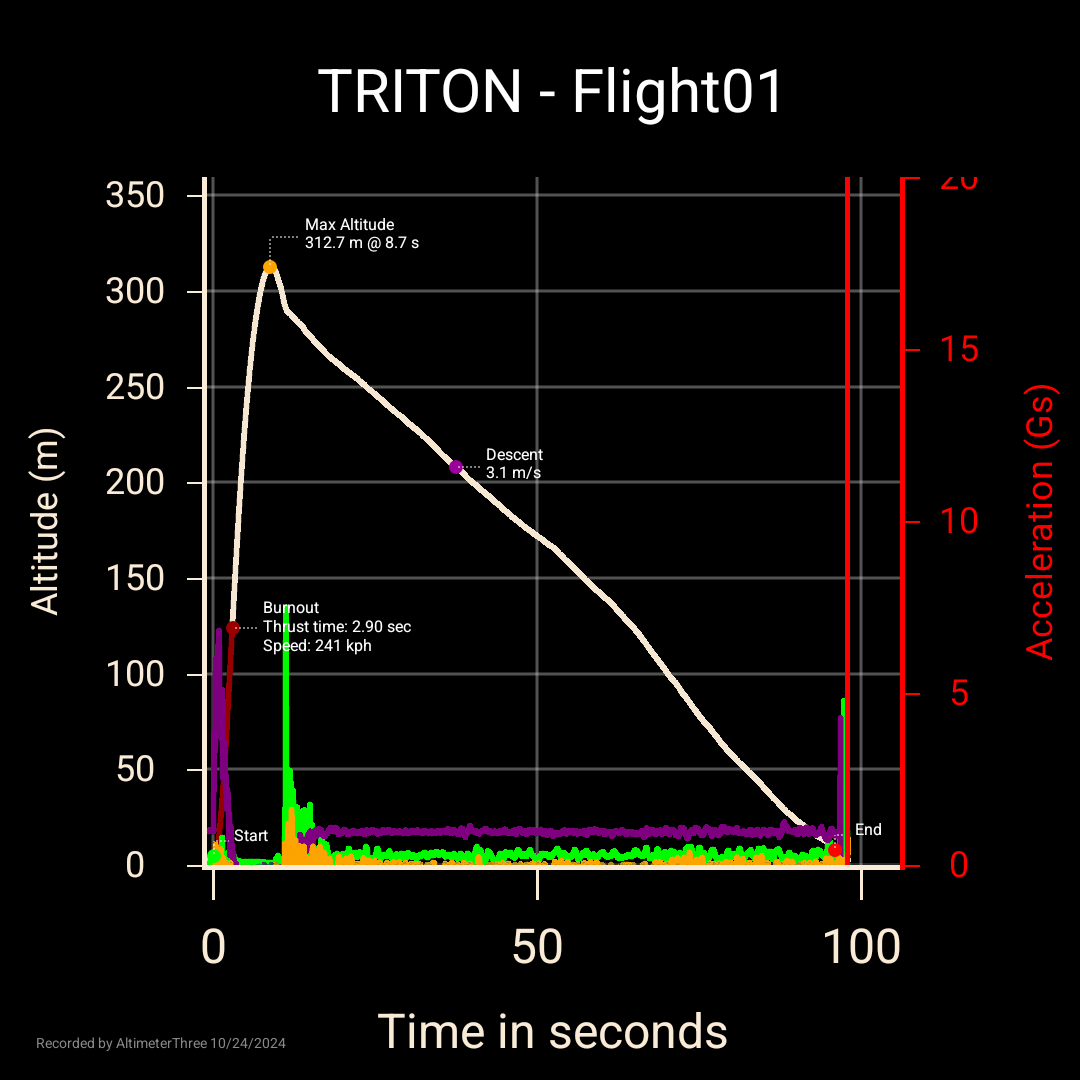 Ich würde gerne einen neuen Deutschen Rekord anmelden: 312m, Klasse4. : ) Es gibt auch ein kleines Filmchen zum Rekordflug, aber bevor ich das auf YT hochlade, möchte ich natürlich den offiziellen Segen für die Rekordmeldung. ; ) Datei-Paket für Rekordmeldung: Edit: Video jetzt hochgeladen: https://youtu.be/RhrX7mGevno Hier sind noch ein paar Daten zur Rakete: TRITON Flight #01 24.10.2024 15:00 CEST Wind 9kts 107° ESE Temperature 15°C Type Water Rocket Body Diameter 100.6 mm Length 2220 mm Dry Mass 1920 g Launch Mass 5120 g Capacity 11.44 l Nozzle Bore 10.0 mm Drag Coefficient 0.402 cd Stability 2.27 cal / 10.8% Max. Pressure 25 bar / 363 psi Flight Pressure 20 bar / 290 psi Peak Thrust 305 N Total Impulse 396 Ns Burn Time 2.9 s Max. Velocity 67 m/s / 241 kp/h Recovery System Automatic Parachute Deployment (Barometric Apogee Detection) Parachute 1600 mm Octagon Electronics/Sensors GPS, Altimeter, 3D-Accelerometer, 4k Camera (Sorry, Formatierung will nicht so wie ich) Schöne Grüße aus Berlin Felix Geändert von BerlinWaterRockets am 09. November 2024 um 19:35 |