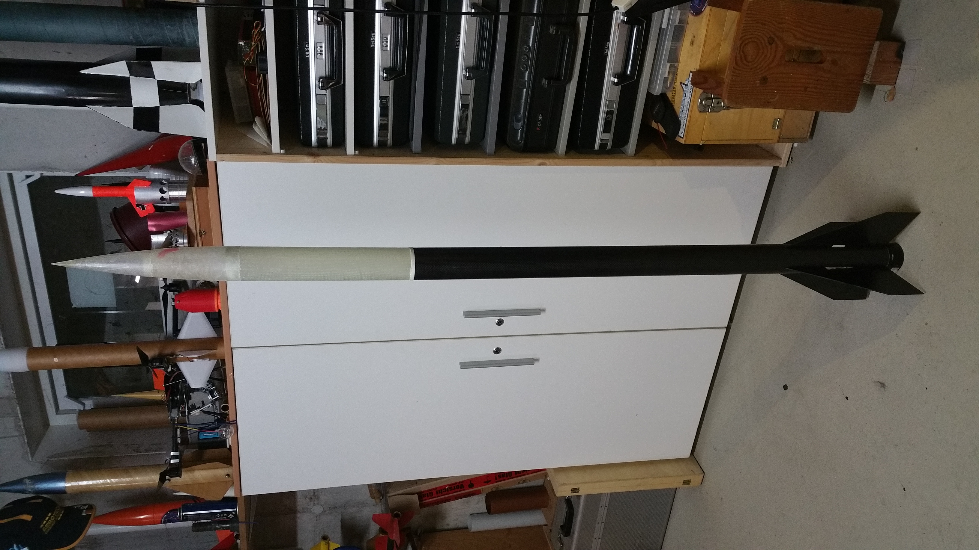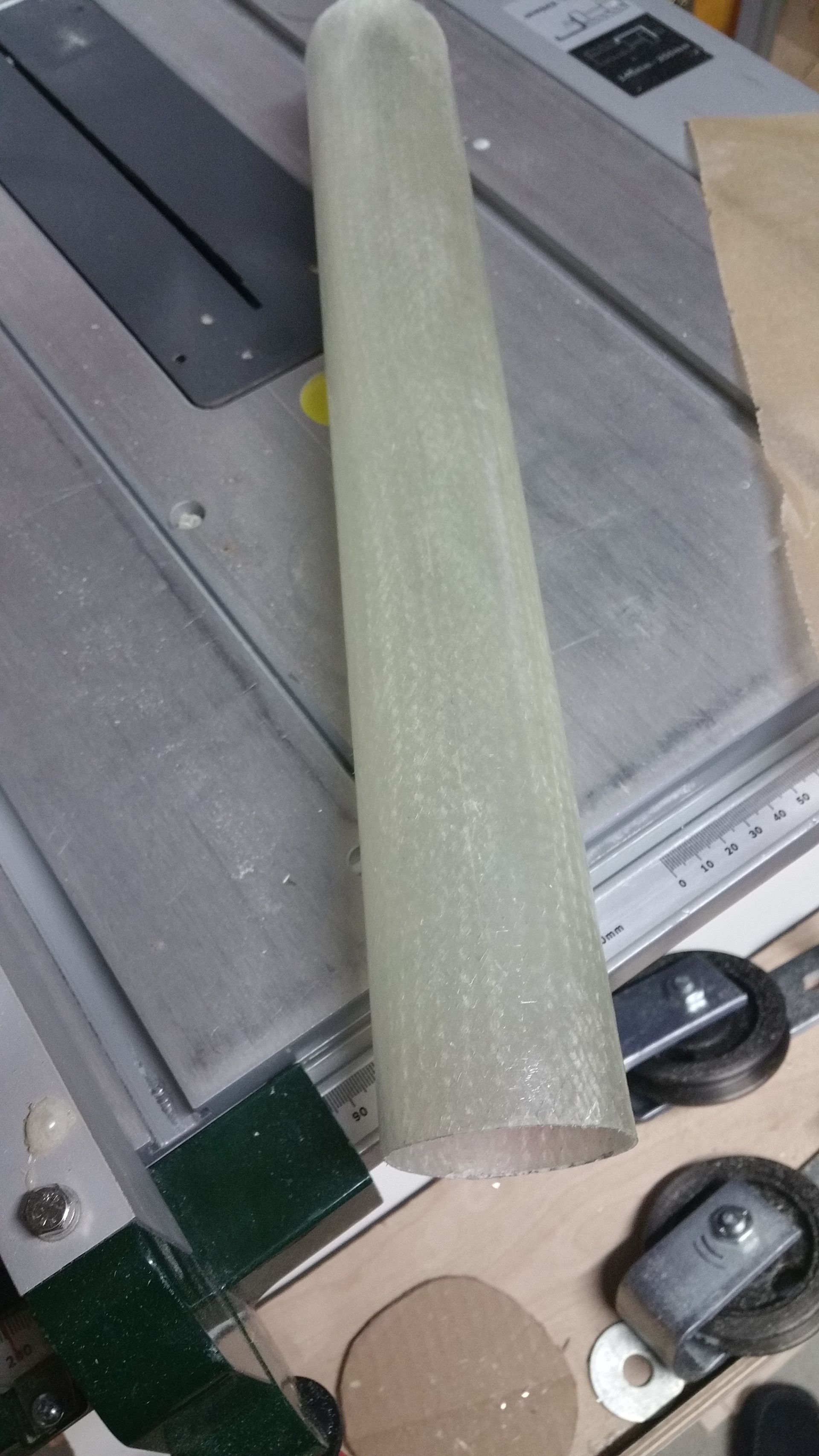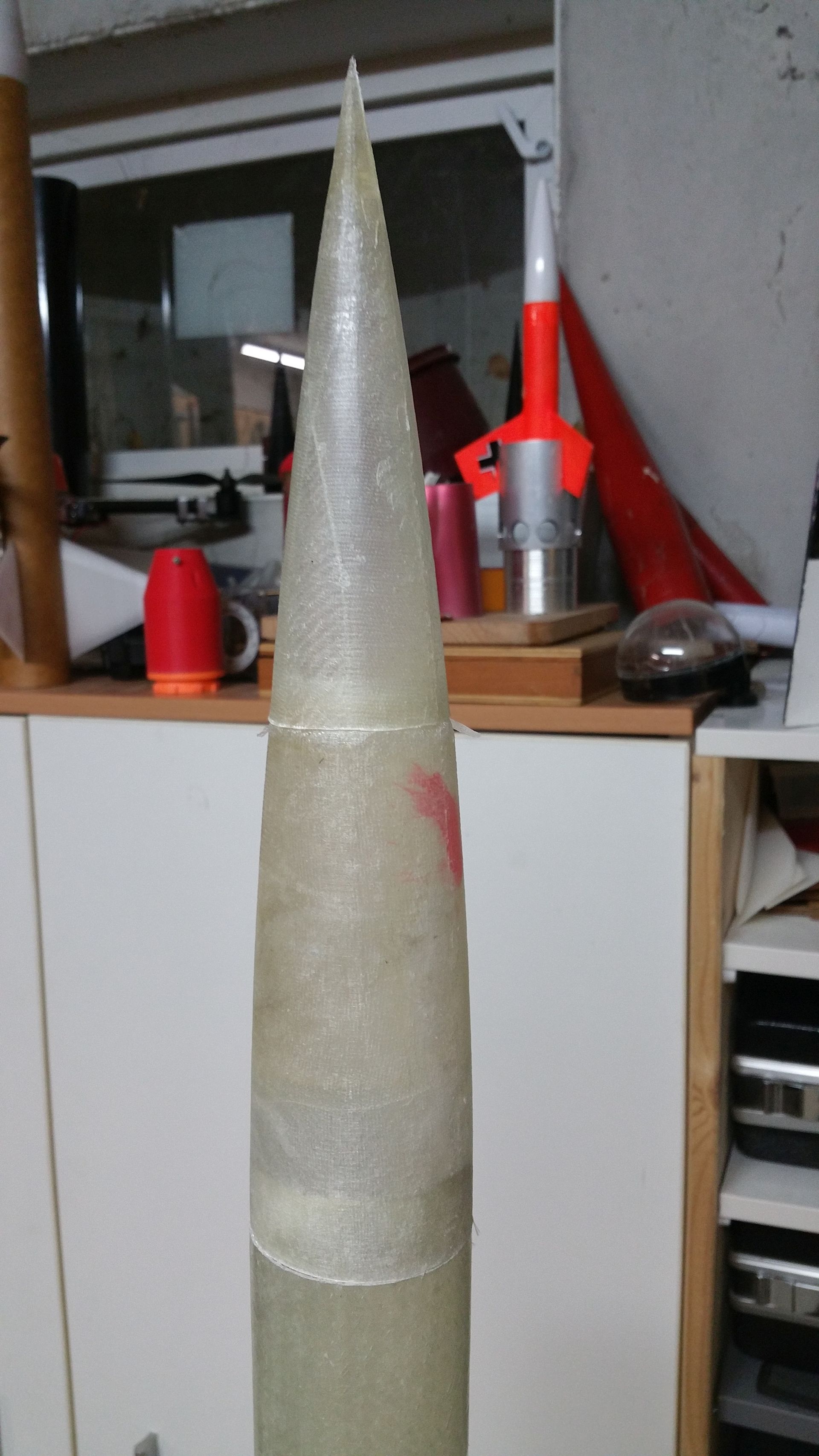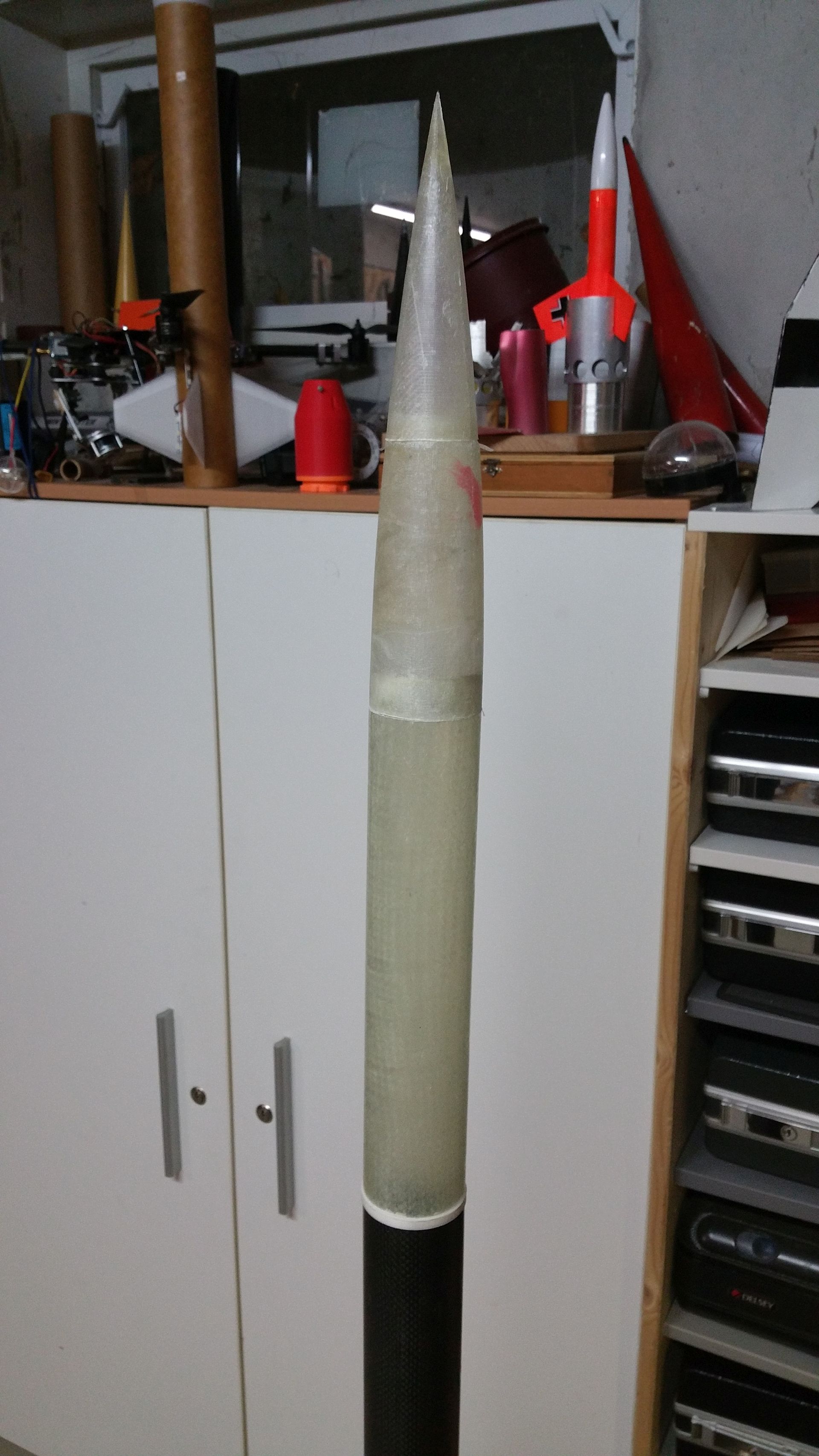 Das nächste Bauteil ist die HF durchlässige Körperrohr Verlängerung. Die ist mit zwei Lagen GFK-Schlauch über das 60mm Alurohr laminiert. Davon gebrauche ich ca. 250 mm. Plus die Gfk Spitze habe ich genug Raum für Antennen, Telemetrie und Bergung. Das ganze obere Teil hat so viel Volumen, das es schwimmen sollte. Man weiß ja nie.