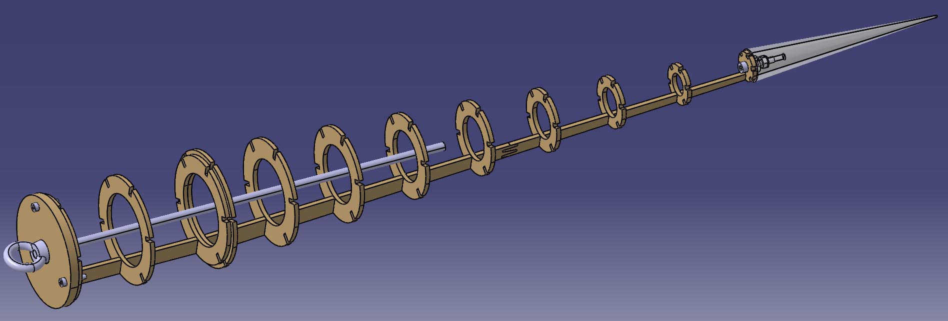 Dieser Screenshot ist vielleicht etwas aufschlussreicher. Links ist der 6-mm-Spant zu sehen, der mit drei M3-Schrauben am dünnen Spant im Kuppler befestigt wird. Mit einer Ringmutter wird hier auch die Gewindestange angebracht. Der kegelförmige Teil ist getrennt vom zylindrischen. Man sieht auch den »geschäfteten« Übergang im Stringer, da meine Fräse nur knapp 30 cm lange Teile bearbeiten kann. Ganz vorne sind die zwei gedruckten Hälften der Spitze sowie die Schraube und Mutter zur Befestigung zu erkennen. Oliver