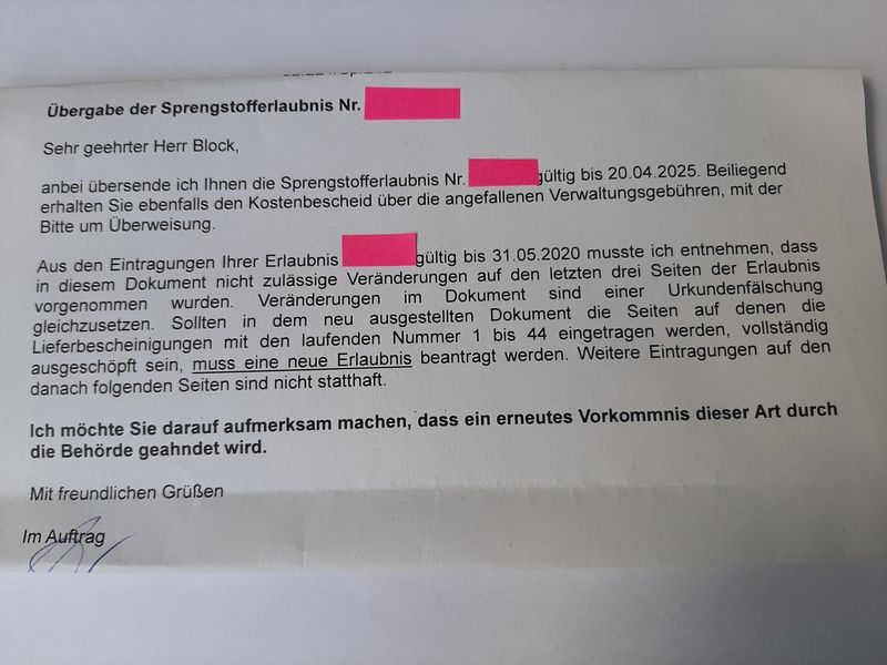 Hi, Andreas! Ich hatte im letzten Dezember verlängert und die Dame explizit darauf angesprochen, dass ja bald kein Platz mehr für Eintragungen wäre. Ihre Meinung war, dass sie kein Problem damit hätte, wenn ich die freien Seiten benutze. Aber schriftlich habe ich das auch nicht. Wird also von Behörde zu Behörde anders gesehen. Bei mir sind die Leute aber zum Glück generell ziemlich entspannt. Ich gehe aber auch extra immer persönlich hin und erkläre kurz das Ganze Thema Raketen. Beim letzten mal hieß es dann auch: Ach, Genau. Sie sind das mit den Raketen  Wahrscheinlich ist es das beste bei "seiner" Behörde vorher mal kurz anzufragen, wenn man vor dem gleichen Problem steht. Viele Grüße Dennis