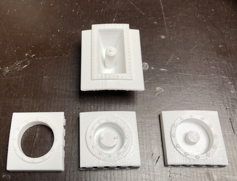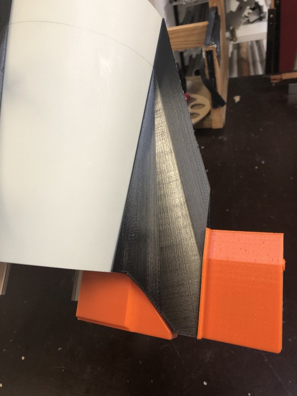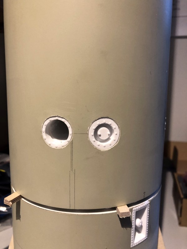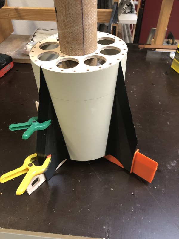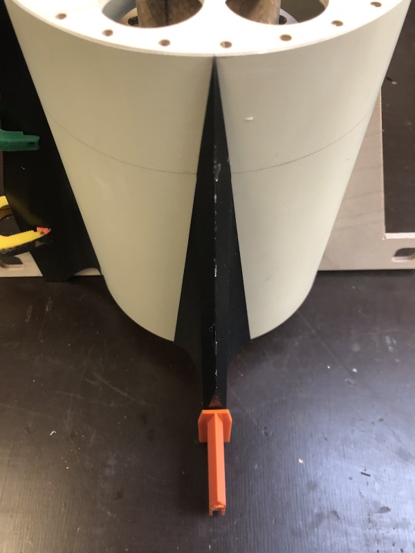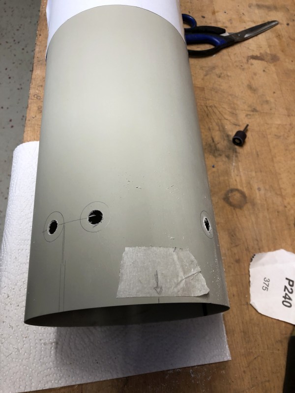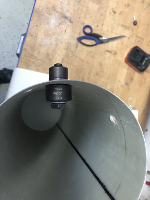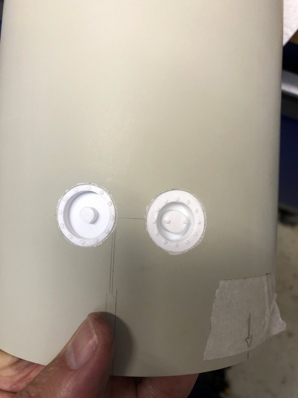 Mitlerweile bin ich wieder etwas weiter. Das Original hat einige Tankanschlüsse im unteren Bereich, Peroxid, Fuel, LOX und LOX Vent Anschlüsse sind das. Die mussten natürlich mit rein. Ich habe sie aus weißem PETG gedruckt und dann in die Rohr eingeklebt. Dabei mussten sie so entworfen werden dass die Rundung des Rohrs dazu passt. Erst mal die Teile ausgedruckt Dann mit einem Lochschneider 19,5mm Löcher geschnitten, hat sich als die praktikabelste Methode herausgestellt.