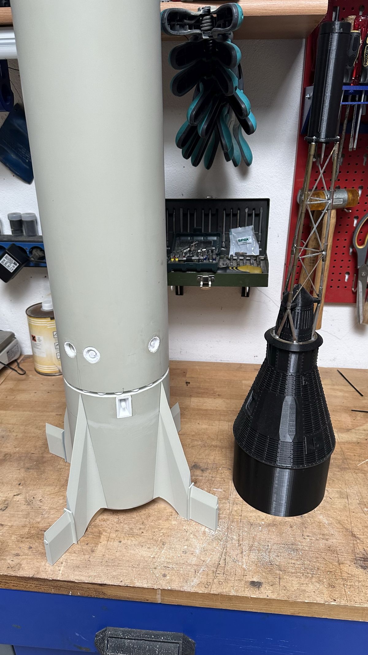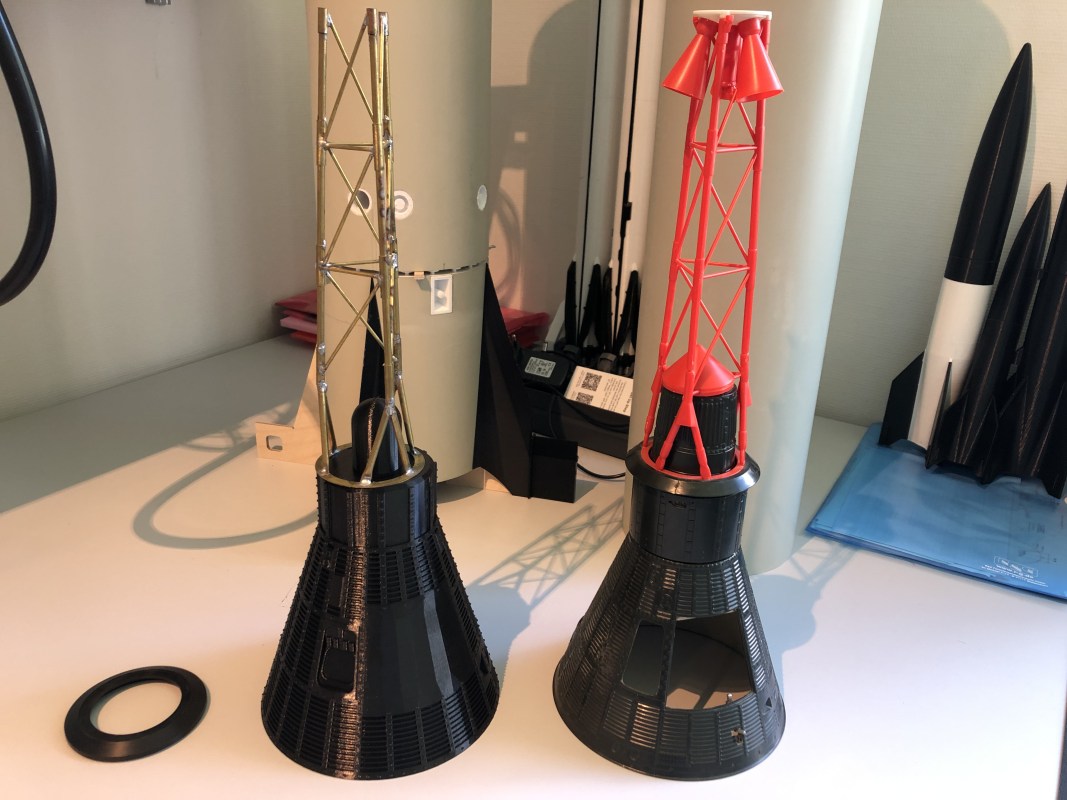 Rohre und Fins sind soweit fertig, die Ebay wird aus einem Rest des Rohres geformt. Dann muss da noch eine Mercury-Kapsel her. Ich habe ein Modell hier mit sehr vielen Details und Astronaut, Cockpit usw. Das sollte ursprünglich mitfliegen, aber ich denke es wird es nicht überleben. Also werde ich die Kapsel doppelt machen: Eine für Show, und eine für den Flug. Die Flugkapsel drucke ich aus PETG aus, ein Modell von Thingiverse diente als Basis, wurde skaliert und ein wenig flugtauglich gemacht. Darauf kommt ein Tower aus Messing, und ganz vielleicht ein echter Rettungsmotor, der den Turm dann im Flug wegzieht, wie beim Original. Da muss ich aber noch Tests machen ob das klappt. Hier erst mal vorab der Vergleich Showkapsel (rechts) vs. Flugkapsel (links)