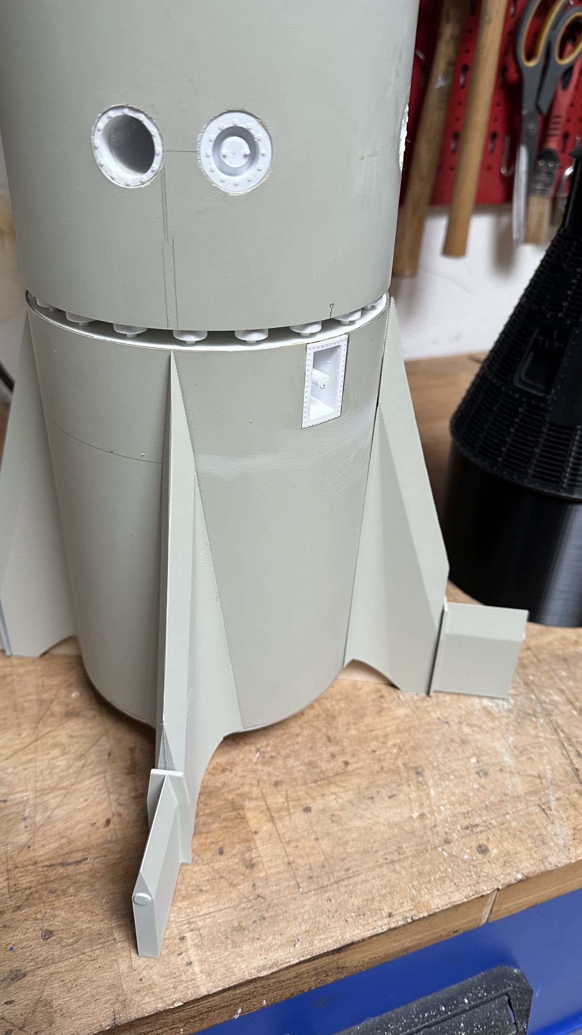 Die Kapsel für sich wiegt 180g und hatte eine Druckzeit von 36 Stunden :-) Ist aber wirklich gut geworden. Da fehlt jetzt noch ein Sockel um sie in das Rohr zu stecken, das druckt gerade, und Teile für den Tower. Das ist gerade in Arbeit.