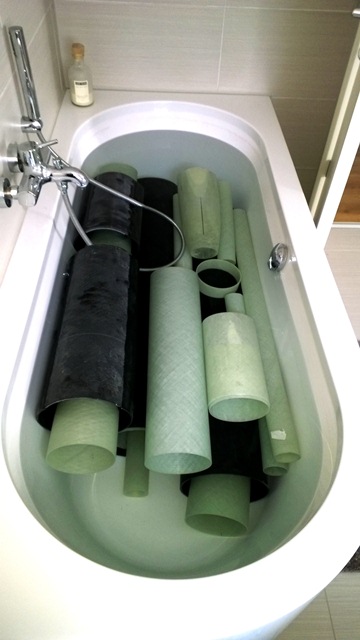 Hallo Paul, zwischen den Hälften habe ich sogar jeweils 2 mm Abstand. Das ist in der Tat eine Sache, die mir in der Planung auch leichte Bauchschmerzen verursacht hat. Das Proberohr ist aber schon recht stramm gewickelt und hat keine Dellen. Die Abstandshalter ließen sich mit noch passablem Kraftaufwand hindurchschieben. Aber wie gesagt, Material, Anzahl und Länge der Abstandshalter sind noch Punkte, über die ich nachdenke; da bin ich sehr dankbar für Kommentare. Auch die Wanddicke des Kernrohres kann man eine Nummer größer wählen. Deine Rohrwickelmethode ist sicherlich immer noch der Goldstandard - wenn man das Belegen mit silikonisiertem Papier beherrscht. Im Gegensatz zu Oliver habe ich da bisher nur Ausschuss produziert. Nachdem ich das dritte Rohr längs auftrennen musste, kam langsam die Erkenntnis, dass für mich Punkt b) essentiell ist... Grüße, Hagen