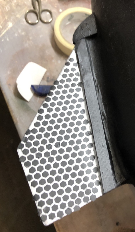 Ich habe mal versucht den Spitzenflügel mit den Kacheln zu bekleben. Vorher habe ich den Flügel silber gesprüht, ich wollte, dass die Struktur der Kacheln so besser zur Geltung kommt. Leider gefällt es mir nicht so richtig. Vielleicht doch engere Zwischenräume? Als ob ich es vorhergesehen hätte, kleben die Kacheln schlecht und einige fallen aus. So musste ich einzelne mit Pinzette nachkleben. Ja, und ich habe die Transferfolie vorher doll angedrückt. Beim Abziehen haben einige fester an der Folie als auf dem Modell geklebt. Habe ich was falsch gemacht?  Rolli