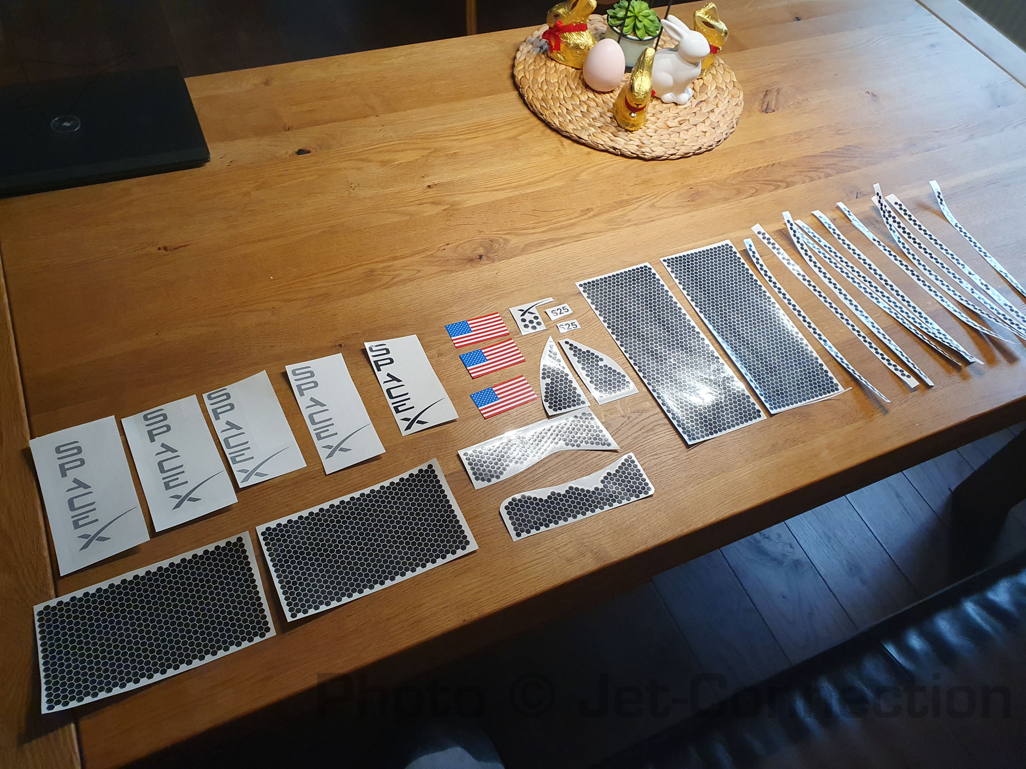 So... Der Plotter kriegt heute Kilometergeld  6 Stunden plotten und entgittern später... habe fertig. Geht nächste Woche raus... Erinnert mich daran das ich nur noch texanische Flaggen mache... Sterne... Sterne... Und so entsteht die Flagge: Irgendwie müsste ein Plotter erfunden werden der den ganzen Kram gleich entgittert  Roilli: Ich habe die SpaceX Schriftzüge zweilmal in silber, zweimal in grau und einmal in Schwarz geschnitten. Schau halt was Du am besten gebrauchen kannst. Von der Größe her sollte das jetzt alles nach Deinen Vorgaben sein. Die Flaggen haben keine Transferfolie, die roten und blauen Folien kleben direkt auf der weissen Grundfolie die Du vom Träger abziehen kannst. Alles andere ist wie gehabt mit Transferfolie belegt. Ich mach erstmal Pause