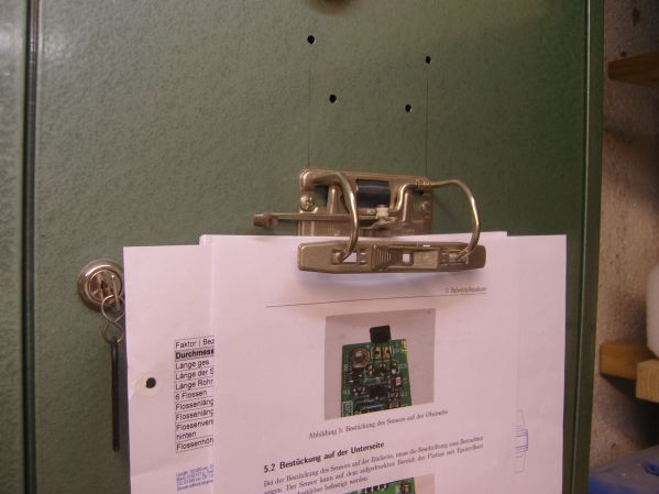 Hallo, ich habe so viele Zettel an meinem Stahlschrank mit Magneten befestigt das zum Testen des ElMaSch fast alles vom Schrank gefallen ist weil ich verschiedene Magnete ausprobieren wollte. Also habe ich die Gelegenheit genutzt und aufgeräumt dabei wollte ich dann die Dokumente in einen Ordner heften, da kam mir eine Idee und ich hab den Ordner von seiner Mechanik befreit und die direkt an den Schrank geschraubt, Ok nach dem zweiten versuch saß dann auch allen an der richtigen Stelle. Jetzt kann ich mal eben an die Steckerbelegung der Altimäxe, des ElMaSch oder an die Spleisanleitung oder oder oder einfach umklappen mit einem Magneten festhalten und die Info ist sofort im Blick. Nebenbei habe ich auch wieder was Rundes in Bau, das ist aber mal wieder nur ein downscale meiner PML Miranda diesmal mit 29mm Motormount. Gruß Andreas