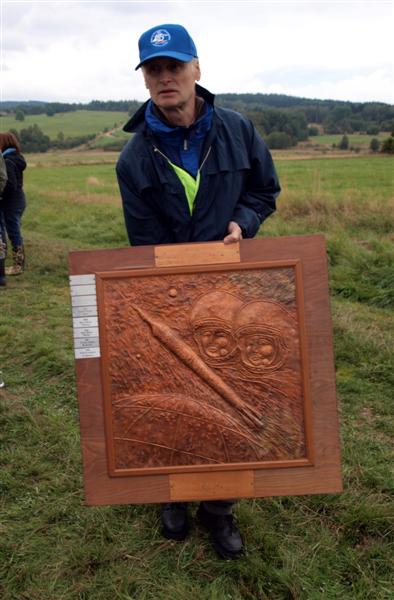 Sigi zeigt den S7 Lackharz Wanderpokal. Zu DDR Zeiten wurde dieser Kupferstich-Pokal an