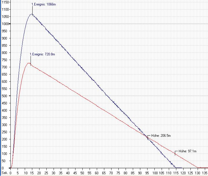 Hier die Daten eines Fluges mit einem AT I366, die Rakete ging dann noch auf 740m, Zeitindex 12.6 sec. Eine Auslösung, wie vom SALT detektiert, bei 2.4 Sekunden wäre also definitiv zu früh gewesen.: ******************************************************************** Höhe Flugzeit Geschwindigkeit ******************************************************************** 0 m | 0.0 s | 0 m/s 2 m | 0.2 s | 10 m/s 4 m | 0.4 s | 10 m/s 11.9 m | 0.6 s | 25 m/s 15.9 m | 0.8 s | 30 m/s 19.8 m | 1.0 s | 20 m/s 25.8 m | 1.2 s | 25 m/s 29.8 m | 1.4 s | 25 m/s 45.7 m | 1.6 s | 50 m/s 57.6 m | 1.8 s | 70 m/s 101.6 m | 2 s | 140 m/s 75.6 m | 2.2 s | 45 m/s 35.7 m | 2.4 s | -165 m/s ----------------------------------------------------------------------------- EREIGNIS: Gipfelpunktsauslösung 2.4 s ----------------------------------------------------------------------------- ----------------------------------------------------------------------------- EREIGNIS: Mindesthöhe 2.4 s ----------------------------------------------------------------------------- 81.6 m | 2.6 s | 15 m/s 113.6 m | 2.8 s | 195 m/s 141.7 m | 3 s | 150 m/s 171.9 m | 3.2 s | 146 m/s 204.2 m | 3.4 s | 156 m/s