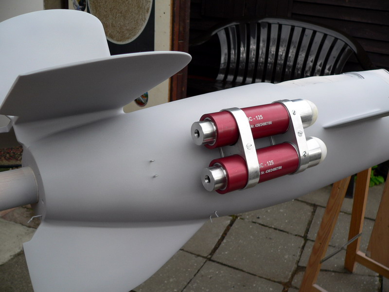 Nach dem aushärten konnte man die Spitzen herausnehmen. Kurz abgeschliffen, innen in der Hülse etwas aufgerauht, und mit Epoxyd festgeklebt. Klar habe ich das Teil nochmals eingespannt und mit etwas Spachtel die kleineren Unebenheiten abgedreht. Zur Gewichtsreduzierung habe ich die kleinen Halbkugeln von innen aufgebohrt. Anschließend wurden die Motoraufnahmehülsen mit meiner Boosterkonstruktion verbunden. Folgende Datei wurde angehängt: