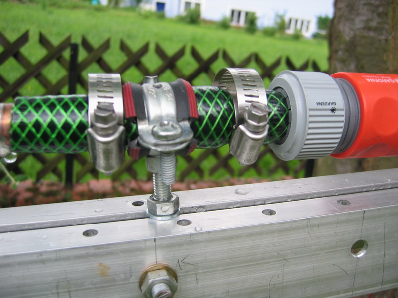 Hallo, ich mache das auch mit einer Rohrschelle, da mir aber der Schlauch mal bei 12bar runtergeploppt ist, verwende ich jetzt 2Rohrschellen die ich vor jedem Starttag neu nachziehe. Auf dem Bild sieht man wie sich der Schlauch aufblaeht zwischen den Schellen. (12Bar) Der Schlauch getestet bis 35bar (bin mir nicht mehr so sicher ist aber sehr hoch) gruss Vince