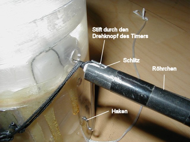 ... Der Haken steht rechtwinklig vom Triggerstab ab und ist fest mit ihm verbunden. Das Ende des Hakens steckt in einem Loch, dass sich im Fallschirmmodul ca. 5 cm unterhalb des Timerknopfes befindet. ... Gruß Robert