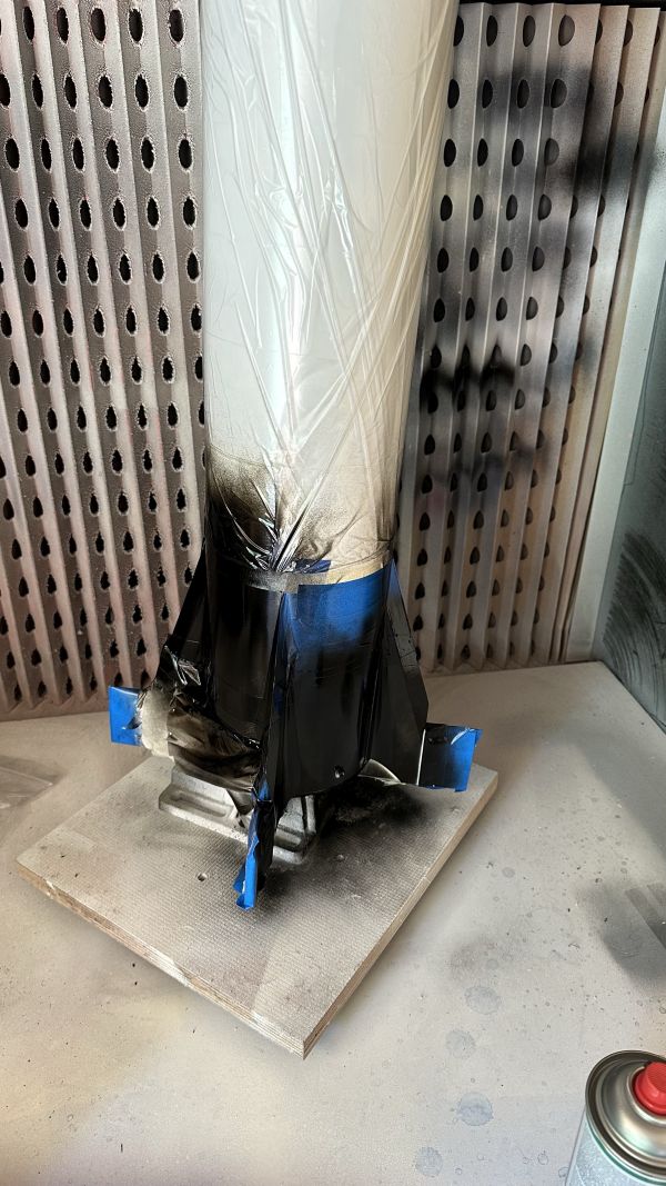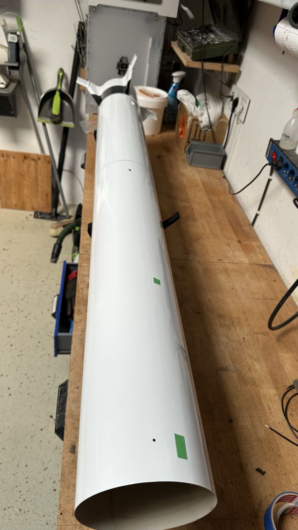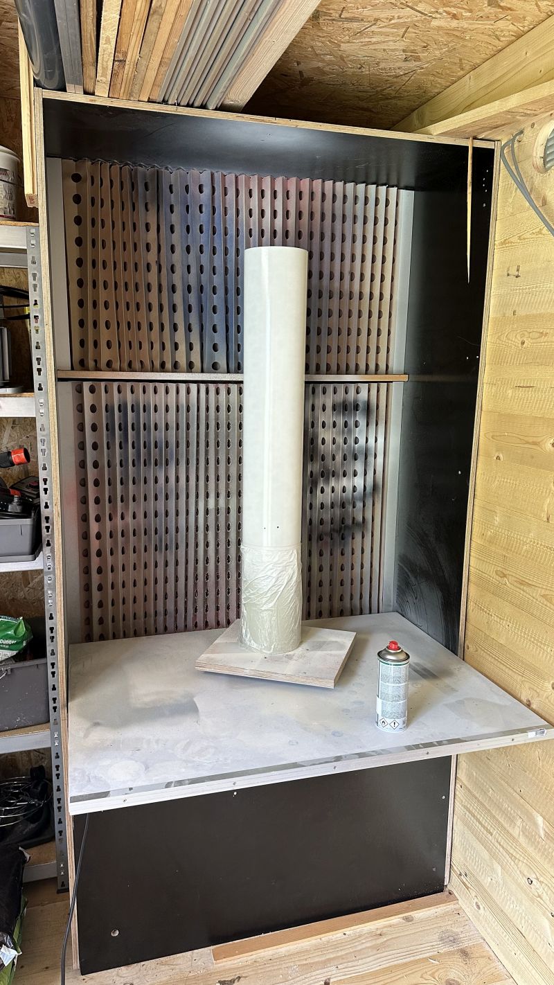 Soll mit einem J-210 von Cesaroni fliegen, ca. 1000m. Heute war schön warmes Wetter, da habe ich mal meine alte Lackierbox reaktiviert, die ist letztes Jahr in unser neues Gartenhaus gezogen. Vorher hatte ich das Monstrum in der Garage, das ist jetzt weitaus besser. Der Abzug geht direkt nach draußen, man kann damit ohne Atemschutz lackieren.