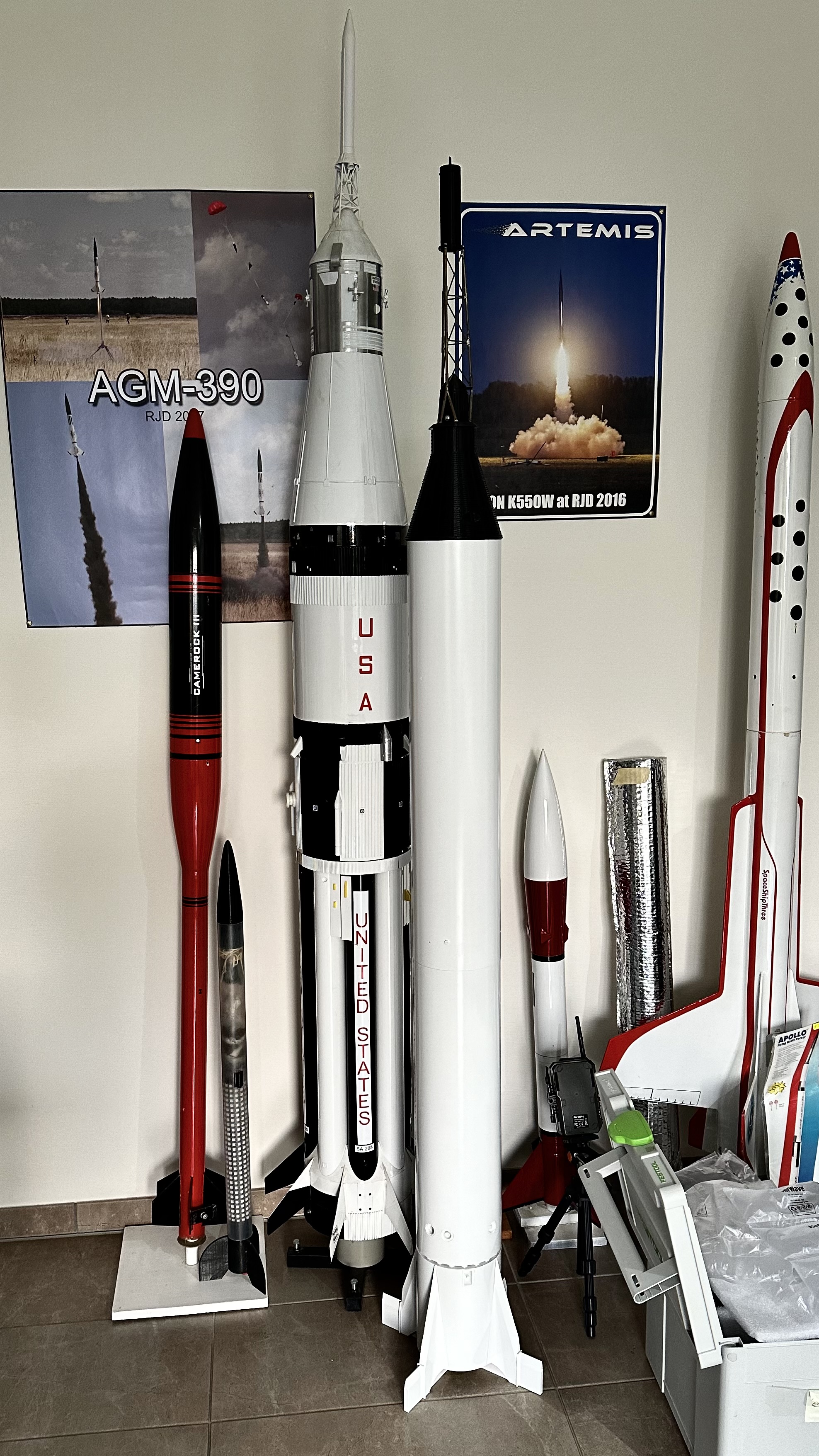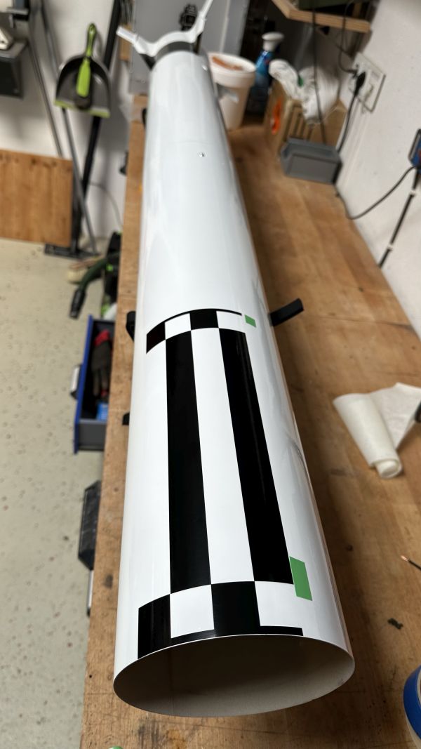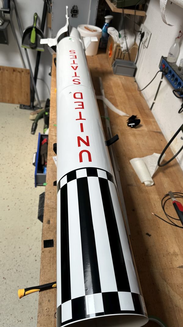 Der der Erstflug beim RJD leider ausfiel mache ich sie nun fertig. Erst mal die schwarzen Teile am Heck abkleben und schwarz lackiert. Dann Hochglanzlack drauf, 2K Lack aus dem Fahrzeugbereich. Lackieren verlernt man scheinbar, meine ersten Versuche waren eher mau, zum Glück habe ich vorher getestet Das habe ich echt ewig nicht mehr gemacht, Jahre ist das her. Das Endergebnis war aber prima, schön glänzend und glatt. Der Vorteil des Lacks ist, dass wenig bis kein Dreck haften bleibt, und man kann die Oberfläche auch mit Lösungsmittel sauber machen. Den oberen Schwarz/Weißen Teil der Instrument Unit habe ich mit Folie gemacht, Lackieren geht bei den Karos kaum. Meine CNC-Fräse hat auch ein Schneidmesser, damit schneide ich Folien. Die werden dann mit viel Spüliwasser aufgelegt, ausgerichtet und angerakelt.