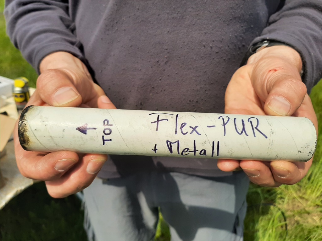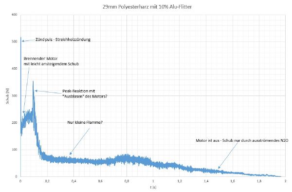 Ein paar Wägezellen haben wir bei ebay "geschossen". Hier kam eine 100kg -Zelle zum Einsatz. Der INA AD8226 verstärkt das Signal des Sensors. Ich nutze eine pos/neg Spannungsversorgung, damit ich auch den vollen ADC-Bereich ohne Offset aufnehmen kann. Logischerweise muss ich vor dem Test den Nullpunkt einstellen. Der Atmega läuft mit 16MHz, somit ist die Sample Rate auf 9.615kSamples/s festgelegt. Schneller geht nur mit einem 20MHz Takt. Dann ist die Sample Rate bei 15.384kSamples/s. ADC Auflösung ist 10bits. Er läuft als kontinuierlich frei laufender ADC. Somit habe ich immer zeitlich äquidistante Abtastwerte. Die Datenübertragung zum Laptop erfolgt über UART-USB-Ethernetkabel 50m mit 500kBaud. Das Protokoll verwendet einen CRC-5 und rolling frame counter, um Paketverlusten oder Fehlern interpolieren zu können. Ich habe aber bisher noch keinen Fehler in der Kommunikation bei allen Messungen gesehen. Ein Python-Script sorgt für das Speichern der Daten auf der Platte. Und hier ein paar Ergebnisse: Der von Andreas beschriebene 38mm Contrail I-290 mit einem Sparky Grain. Die Begrenzung am Beginn ist leider durch die Elektronik bestimmt. Da ich die geringe ADC-Auflösung bestmöglich nutzen wollte, arbeitet die Elektronik mit einer hohen Verstärkung, so dass die obere ADC-Grenze (5V/1023LSB) durch die "Schokoladen"-Zündung schnell erreicht wurde. Diesen ersten Peak unterschätze ich jedes Mal. I-290 war es nicht ganz. Aber als I-230 geht er sicher durch. Dann konnten wir noch eine Supermischung von Trevize testen. Ebenfalls ein 38mm Motor mit einem FlexPUR Grain in der gleichen Leistungsklasse I-230: Aus dem Video habe ich mal meine Begeisterung herausgeschnitten. Sohn hat sich beschwert Leider hat nicht alles geklappt. Ich habe ja eine ganze Reihe Contrail 29mm Motoren, deren Schub/Impuls nicht ganz bekannt ist. Daher kommt auch das Interesse an dem Schubmessstand. Hier ein Beispiel, das ein Motor zündet, aus geht und vor sich hin brennt, ohne weiteren Schub zu erzeugen. Warum ist mir erstmal noch unklar. Der Grain ist nicht von Contrail sondern besteht aus Polyesterharz. Im Video ist zu erkennen, dass er wirklich noch brennt. Wenn jemand eine Erklärung hat, immer her damit! Der gleiche Motor mit einem PVC-Grain erzeugt etwa einen I-200. Und eine Abschlussbemerkung: Es war trotz des letzten Fehlers ein schöner Tag. Familie hat sich gefreut. Andreas, danke für die Hilfe und Organisation! Wir hatten Spaß. Geändert von torstenb am 12. Juni 2021 um 11:32 |
