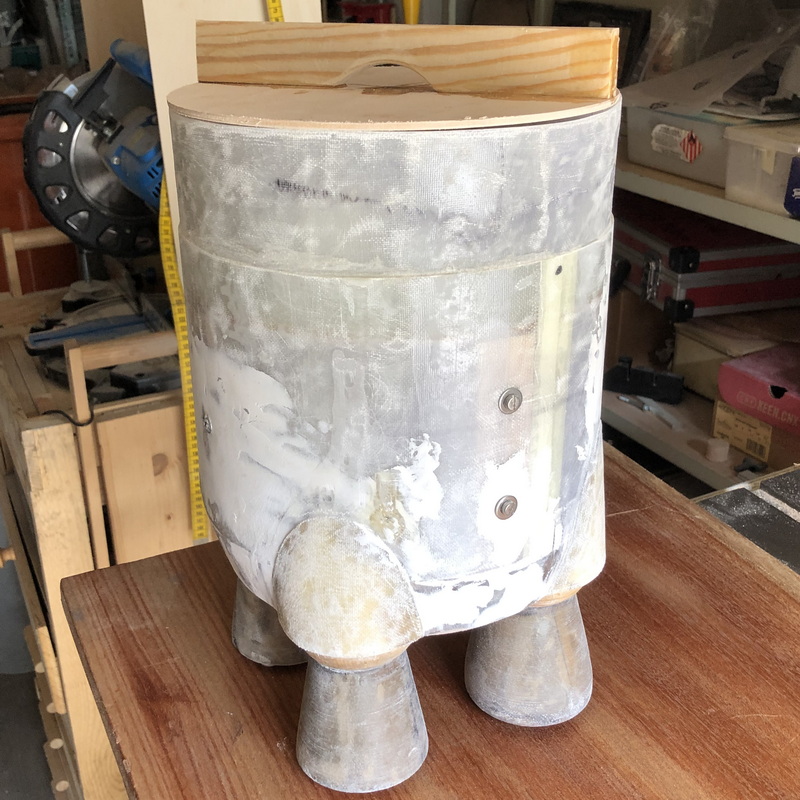 Das Service-Modul der Orionkapsel war einfach zu bauen. Ein Zylinder aus Zeichenkarton, verstärkt durch einen runden Spant auf den Stageadapter laminieren. Der Spant wird natürlich nach dem aushärten entfernt. Das Harz läuft von allein in den kleinen überstehenden Rand vom Adapter. Logisch, die Ränder bzw Übergänge müssen noch auf Kante geschliffen werden. In dem Service-Modul werde ich die Elektronik für die Trennladungen unterbringen. Vielleicht kann man die Apolloelektronik von damals einbauen. Ab jetzt passt sie im Ganzen nicht mehr in die Werkstatt.