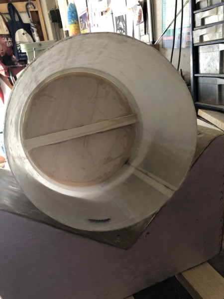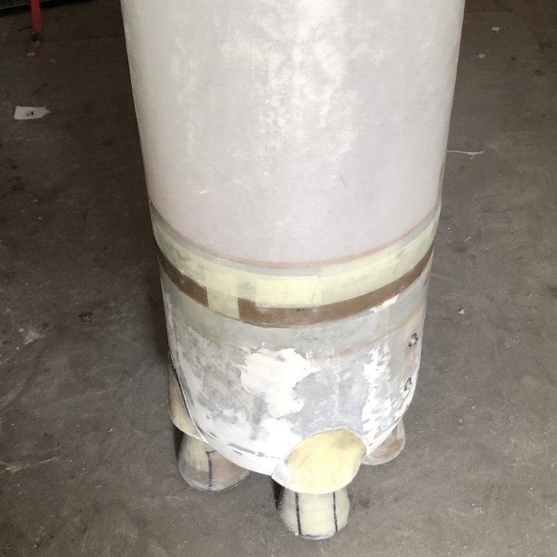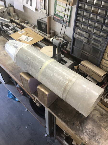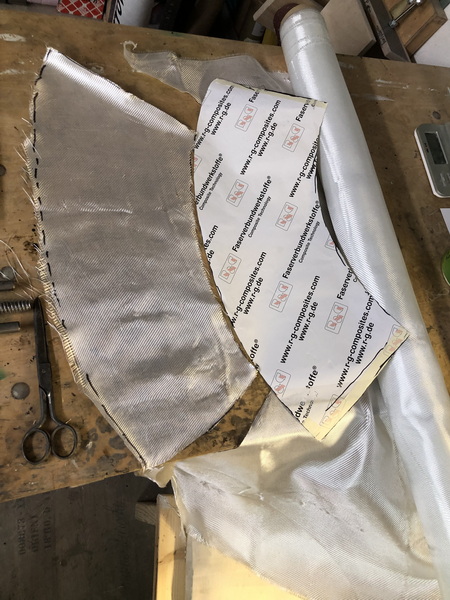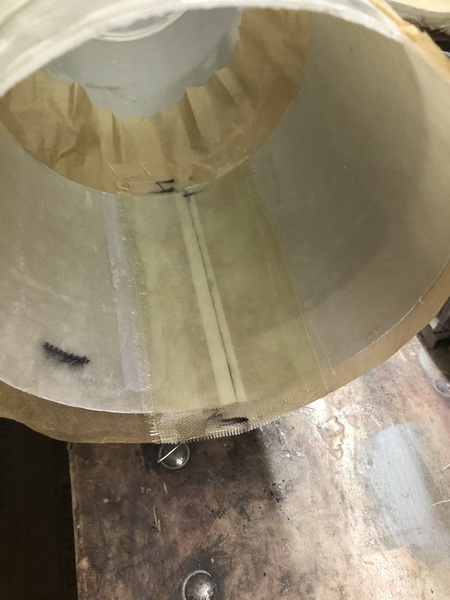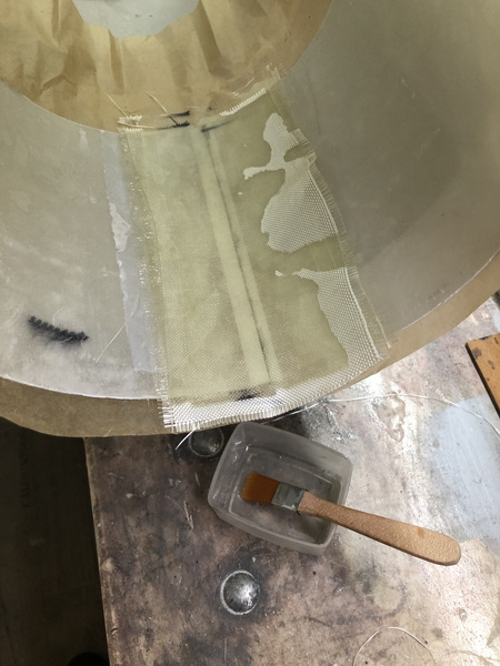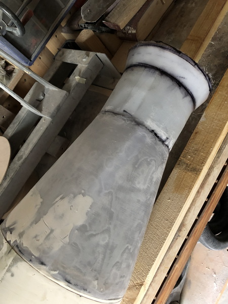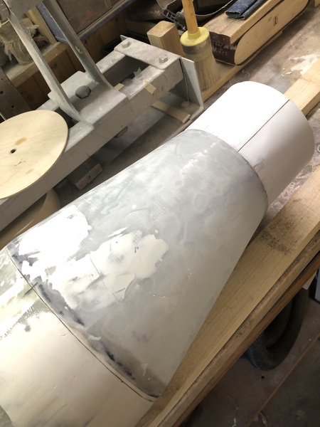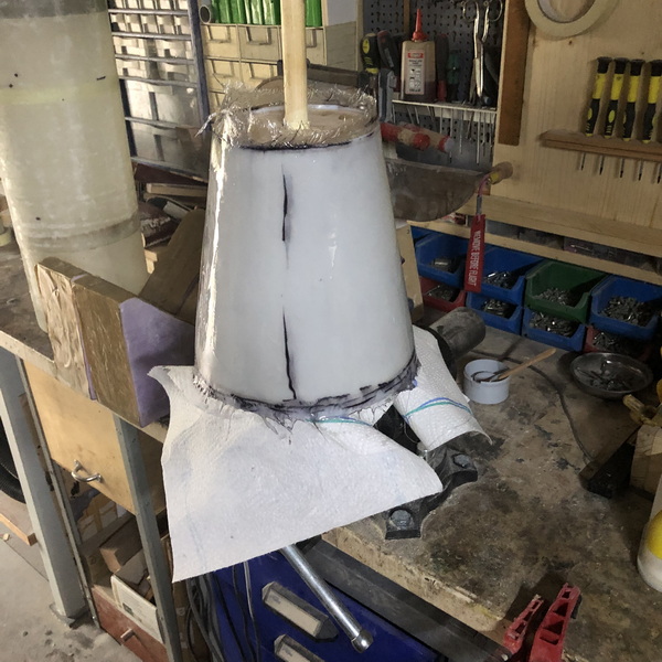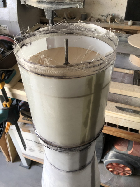Das nächste Teil ist wieder konisch. Der "Orion Stage Adapter" Die gleiche Prozedur wie beim letzten mal, nur kleiner. dieses mal habe ich erst den Adapter mit Tape angeheftet, dann mit Epoxy festgeklebt und zusätzlich noch mit Restern von Glas verstärkt. Nun von außen mit Glas belegt und den Durchmesser angeglichen. Zusätzlich wurde noch ein Spant eingeharzt.